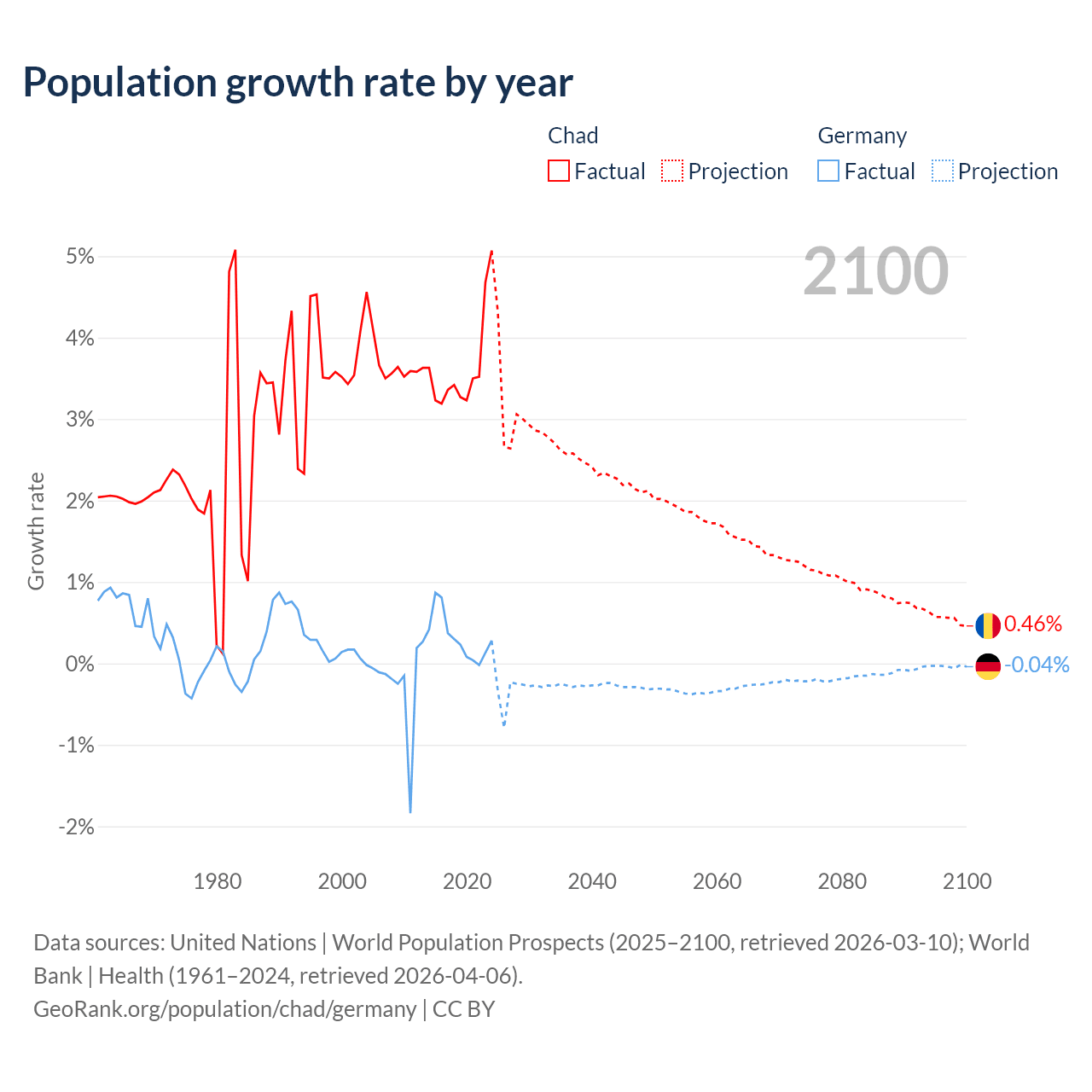 - For the last 10 years, Chad has had an average growth rate of +3.65% per year vs +0.32% in Germany.