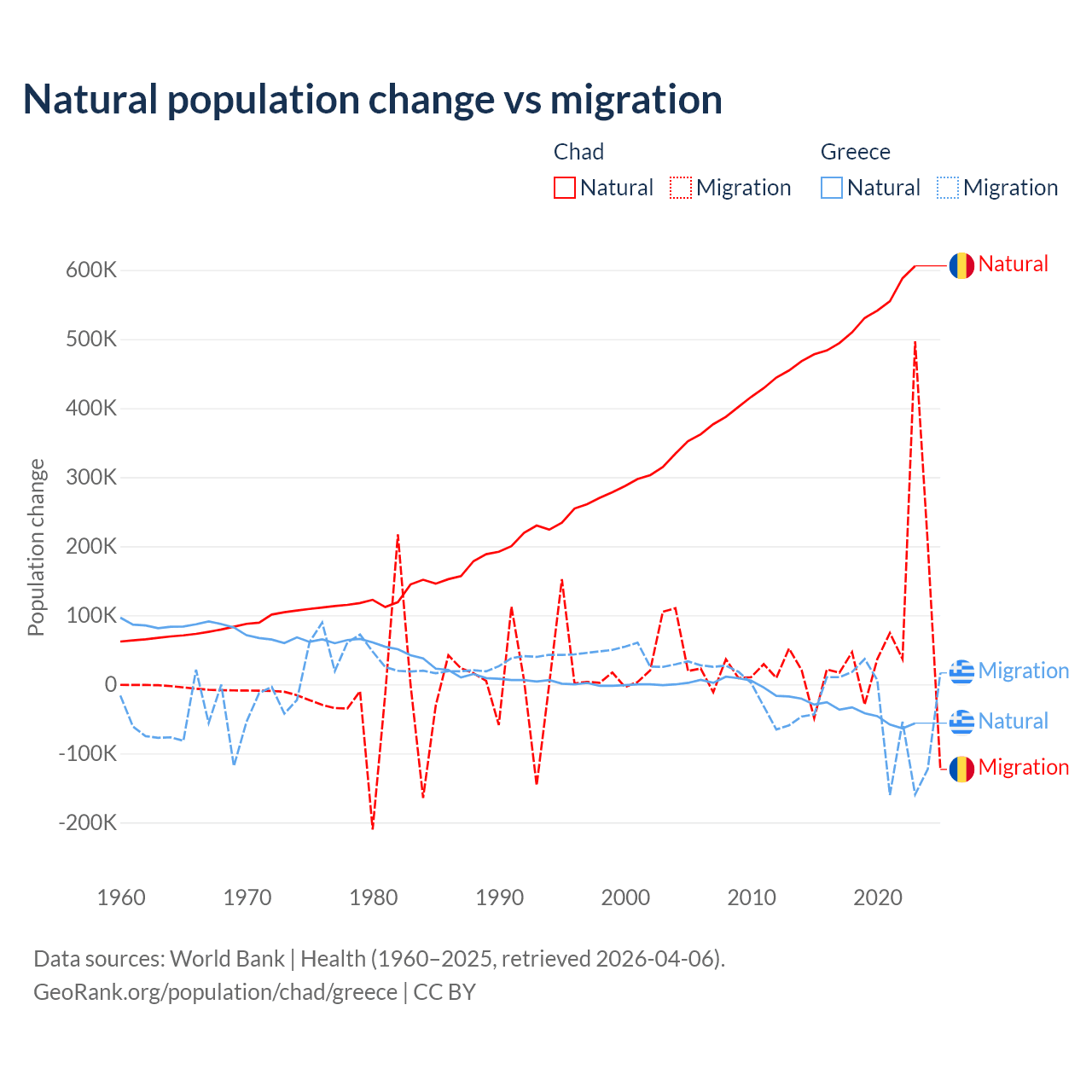 Over the last 10 years, 88.7% of the population change in Chad is from natural causes (a gain of 5,253,964 people) and 11.3% is from migration (a gain of 672,204 people). In Greece 51.9% is from natural causes (a loss of 411,426 people) and 48.1% is from migration (a loss of 381,824 people).