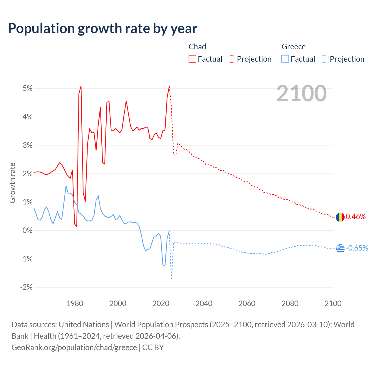 - For the last 10 years, Chad has had an average growth rate of +3.65% per year vs -0.47% in Greece.