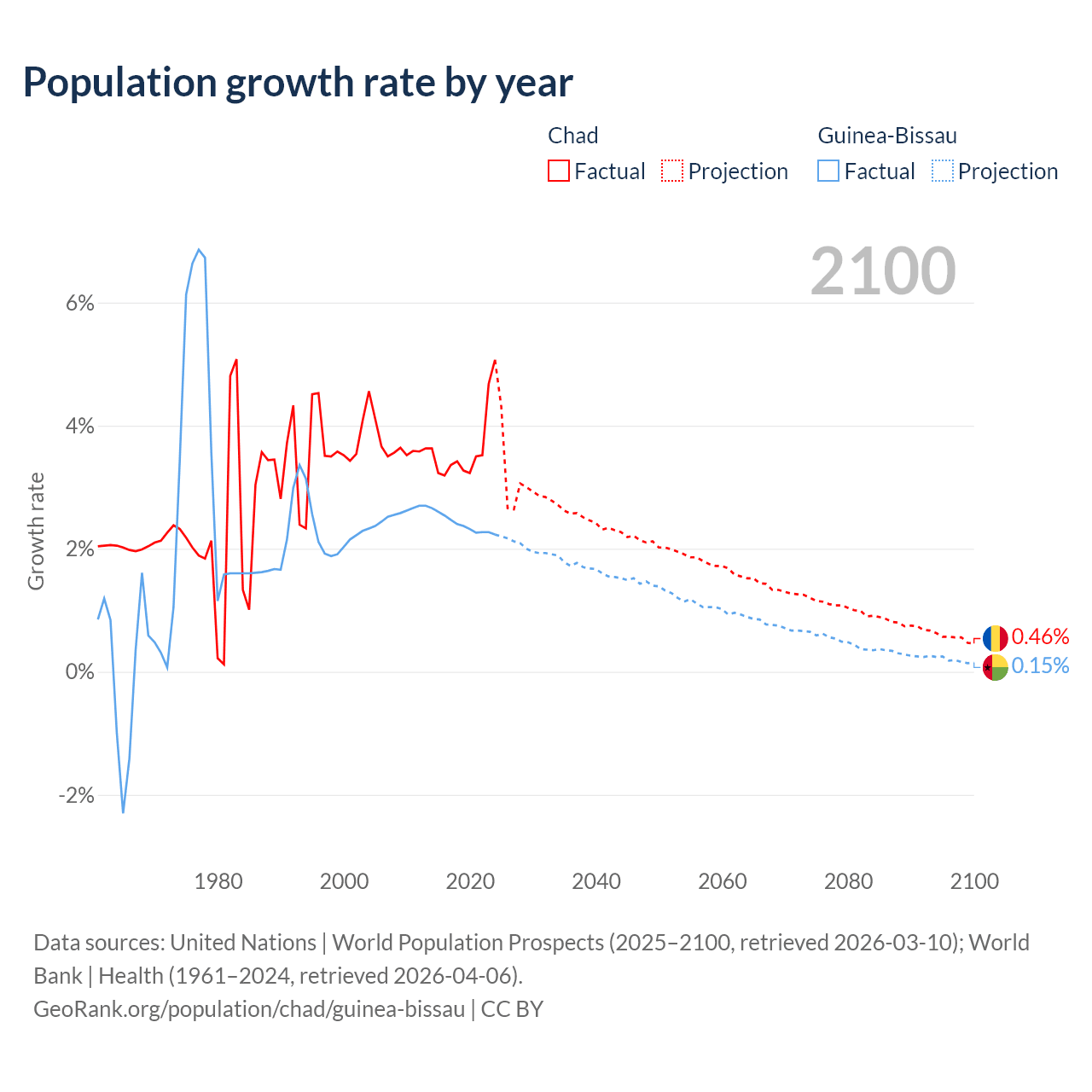 - For the last 10 years, Chad has had an average growth rate of +3.65% per year vs +2.4% in Guinea-Bissau.