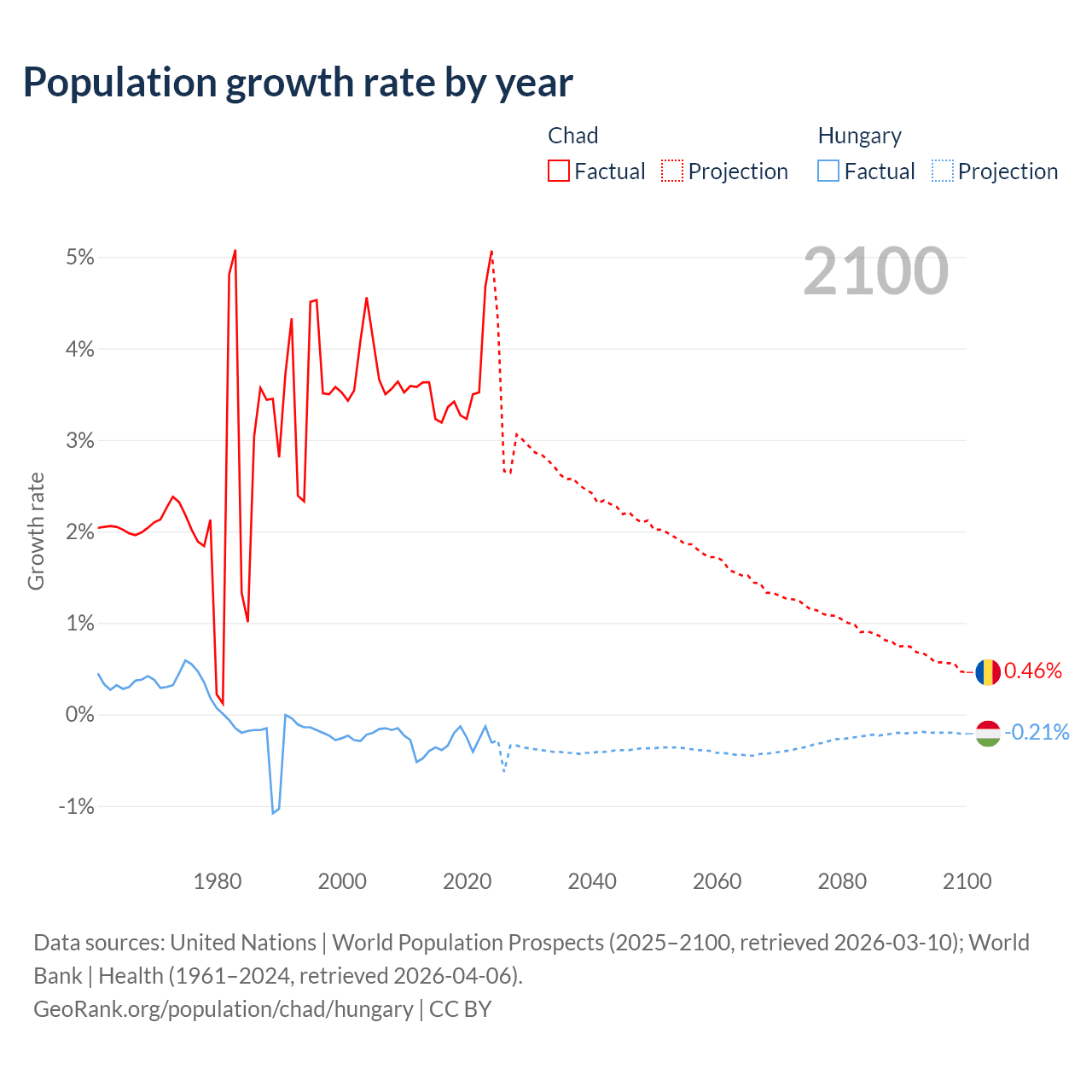 - For the last 10 years, Chad has had an average growth rate of +3.65% per year vs -0.29% in Hungary.