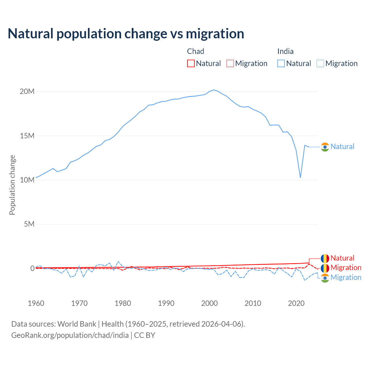 Over the last 10 years, 88.7% of the population change in Chad is from natural causes (a gain of 5,253,964 people) and 11.3% is from migration (a gain of 672,204 people). In India 96.4% is from natural causes (a gain of 145,503,378 people) and 3.56% is from migration (a loss of 5,376,884 people).