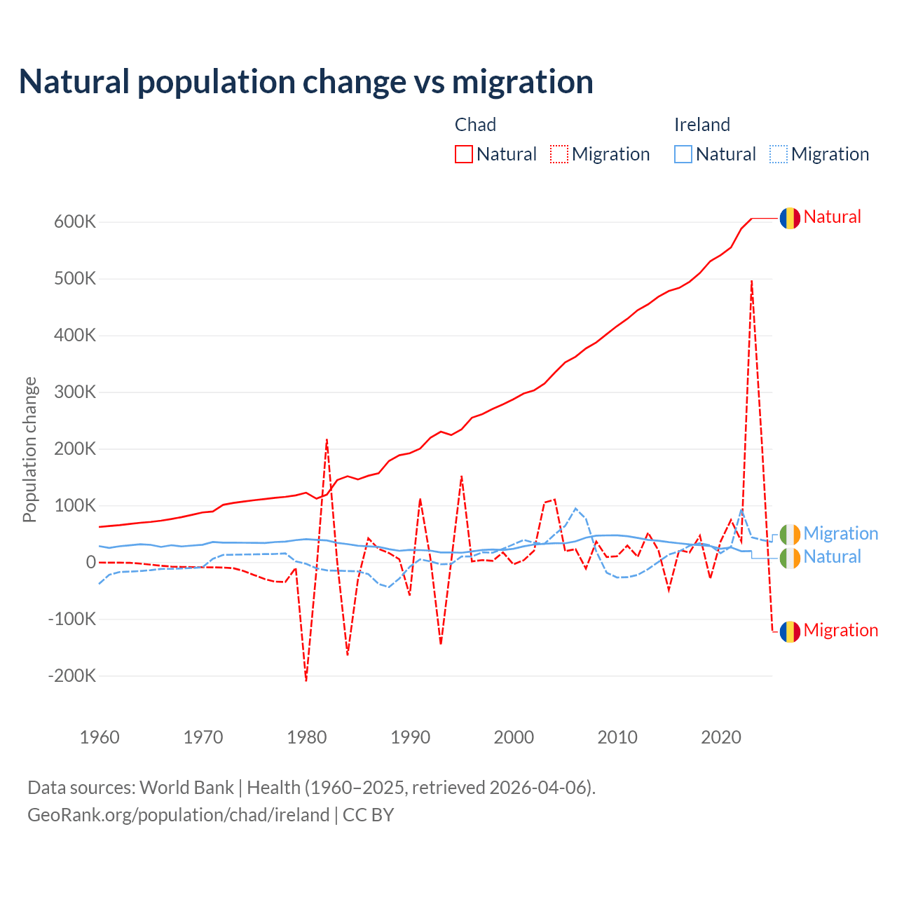 Over the last 10 years, 88.7% of the population change in Chad is from natural causes (a gain of 5,253,964 people) and 11.3% is from migration (a gain of 672,204 people). In Ireland 48.2% is from natural causes (a gain of 284,644 people) and 51.8% is from migration (a gain of 305,297 people).