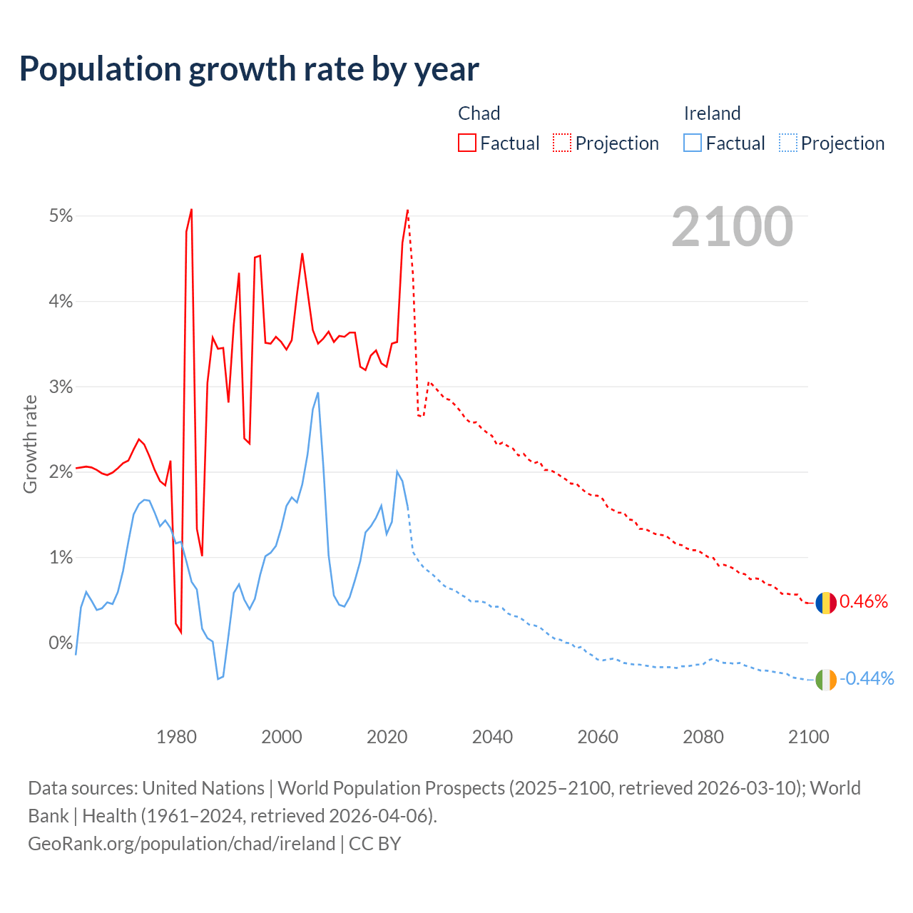 - For the last 10 years, Chad has had an average growth rate of +3.65% per year vs +1.41% in Ireland.