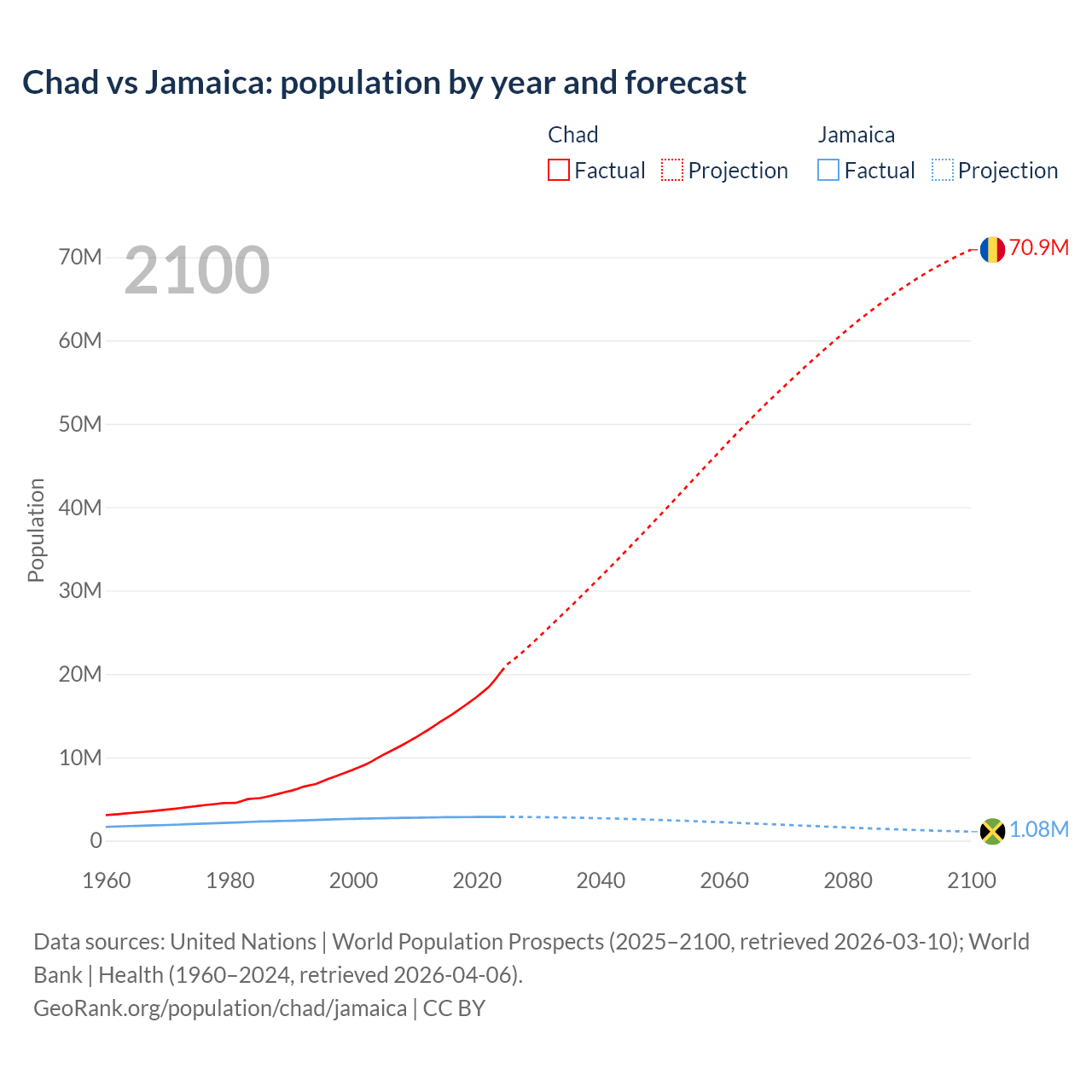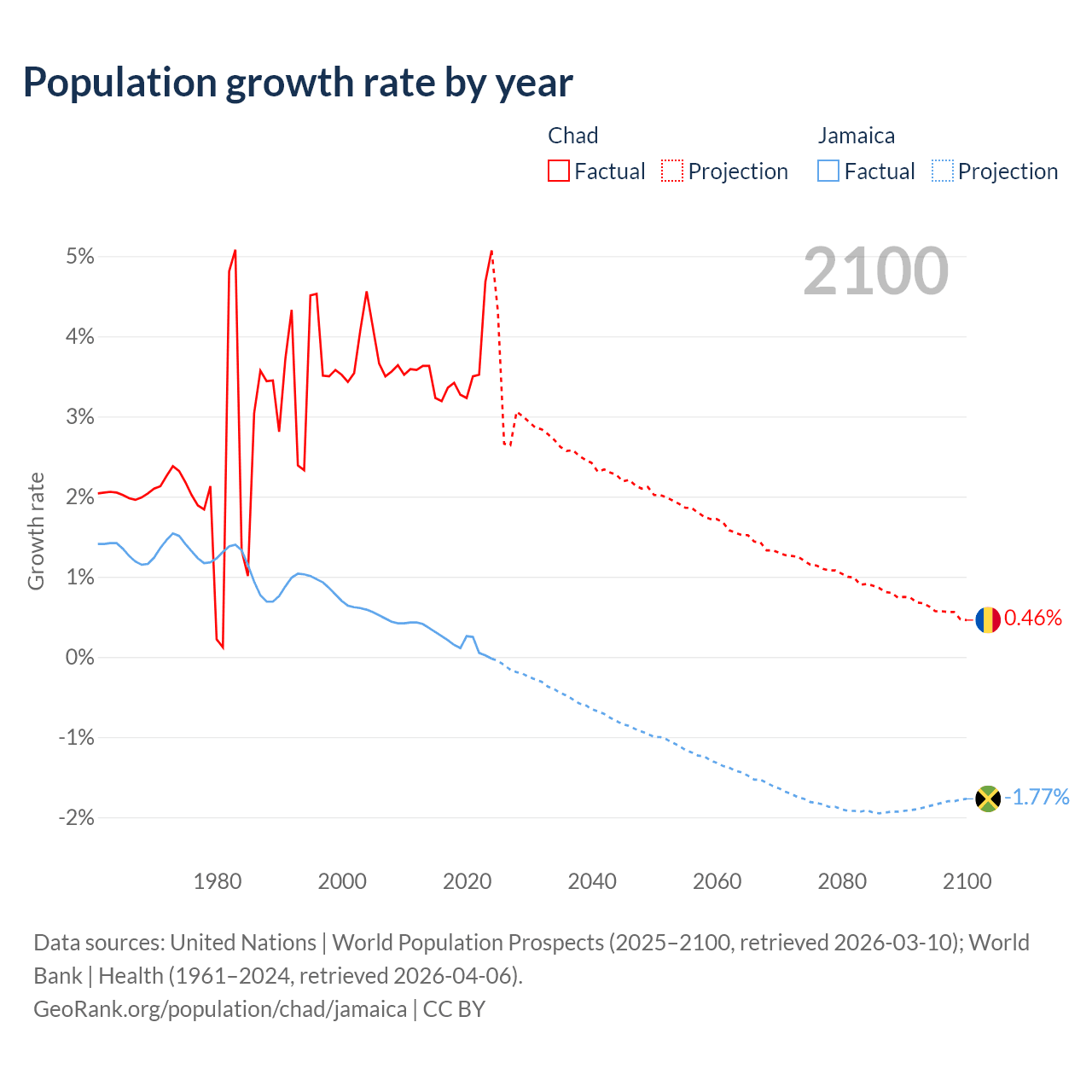 - For the last 10 years, Chad has had an average growth rate of +3.65% per year vs +0.18% in Jamaica.