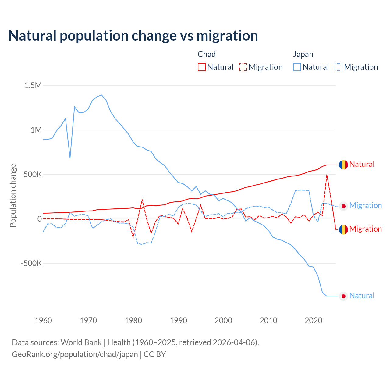 Over the last 10 years, 88.7% of the population change in Chad is from natural causes (a gain of 5,253,964 people) and 11.3% is from migration (a gain of 672,204 people). In Japan 73.6% is from natural causes (a loss of 5,178,838 people) and 26.4% is from migration (a gain of 1,860,103 people).