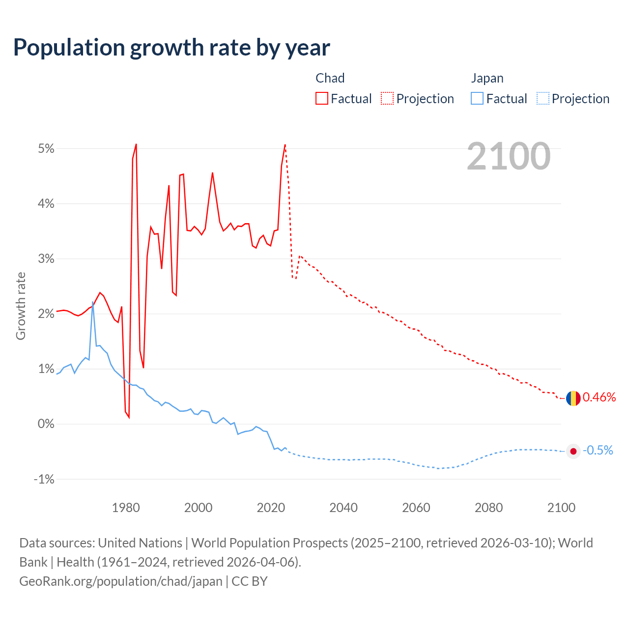 - For the last 10 years, Chad has had an average growth rate of +3.65% per year vs -0.25% in Japan.