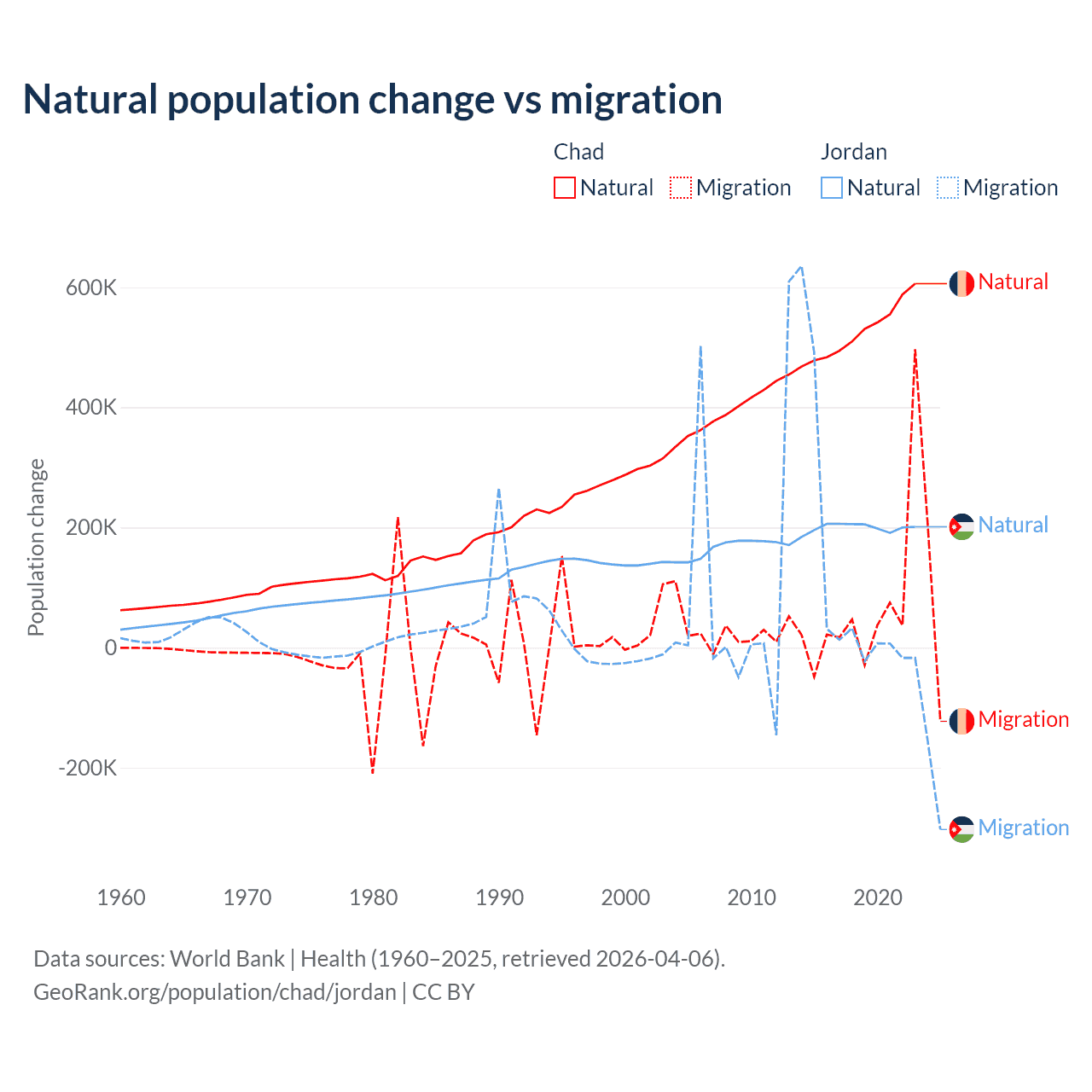 Over the last 10 years, 88.7% of the population change in Chad is from natural causes (a gain of 5,253,964 people) and 11.3% is from migration (a gain of 672,204 people). In Jordan 63.2% is from natural causes (a gain of 1,991,452 people) and 36.8% is from migration (a gain of 1,157,625 people).