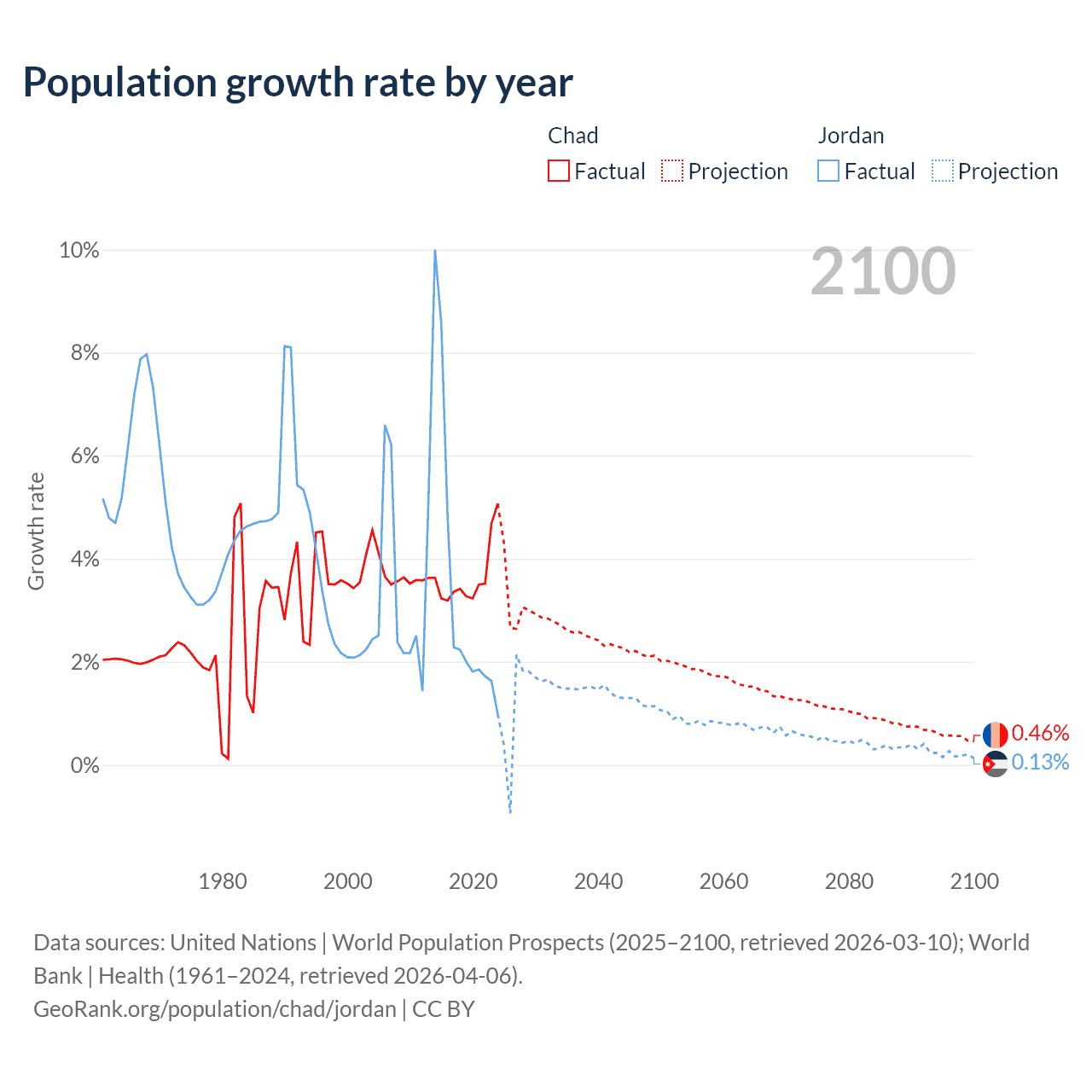 - For the last 10 years, Chad has had an average growth rate of +3.65% per year vs +3.45% in Jordan.