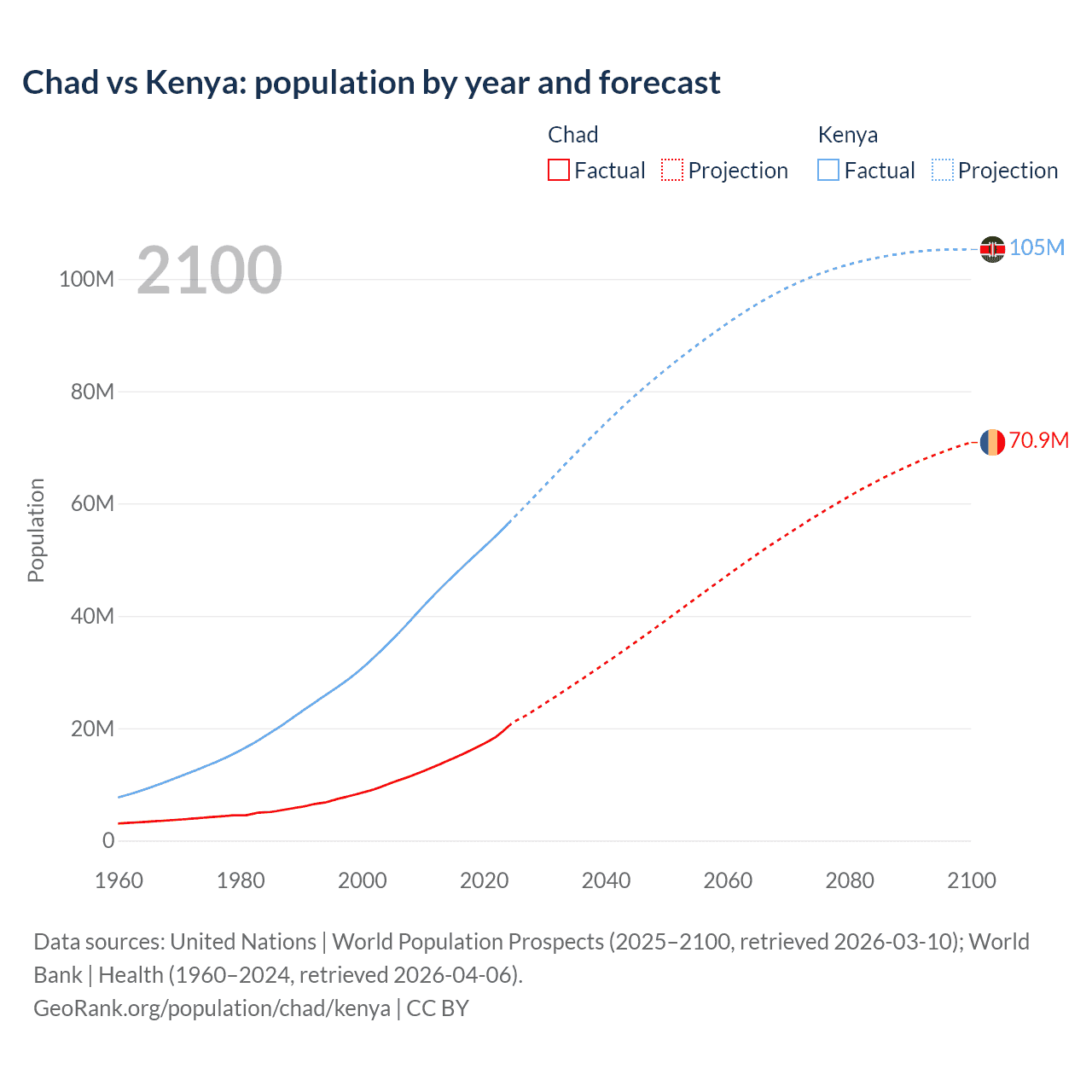 The latest officially reported population of Chad was 20,299,123 in 2024 vs 56,432,944 people in Kenya in 2024. In 2026, based on the adjusted UN estimation, the current Chad's population is 21,893,857 people compared to 58,955,623 in Kenya.