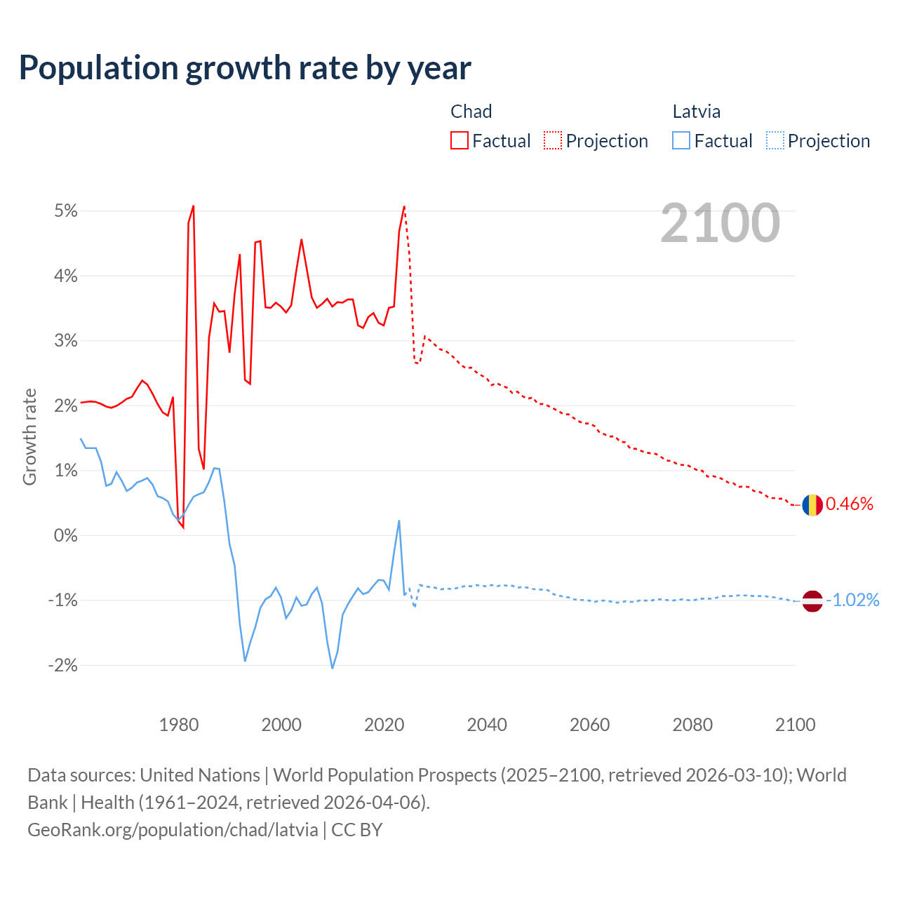 - For the last 10 years, Chad has had an average growth rate of +3.65% per year vs -0.68% in Latvia.