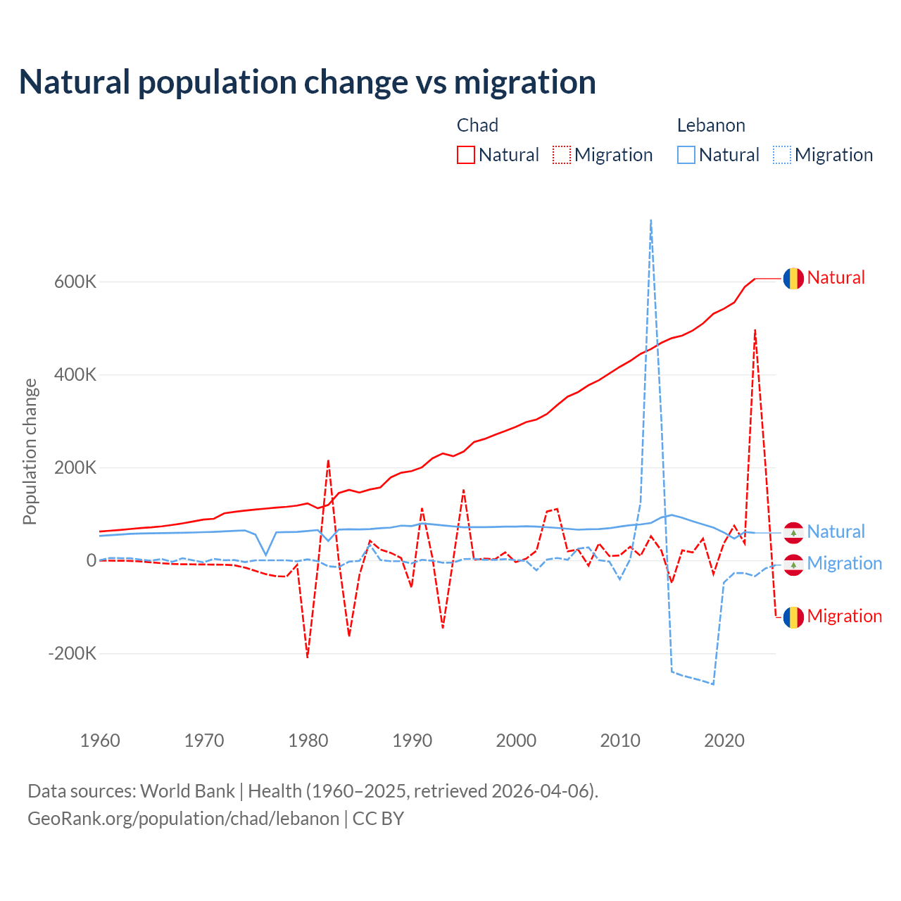 Over the last 10 years, 88.7% of the population change in Chad is from natural causes (a gain of 5,253,964 people) and 11.3% is from migration (a gain of 672,204 people). In Lebanon 40.1% is from natural causes (a gain of 739,256 people) and 59.9% is from migration (a loss of 1,103,772 people).