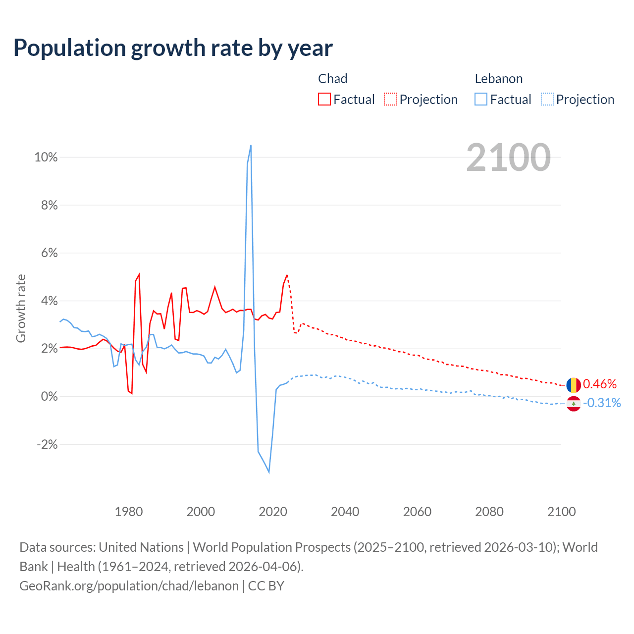 - For the last 10 years, Chad has had an average growth rate of +3.65% per year vs +0.16% in Lebanon.