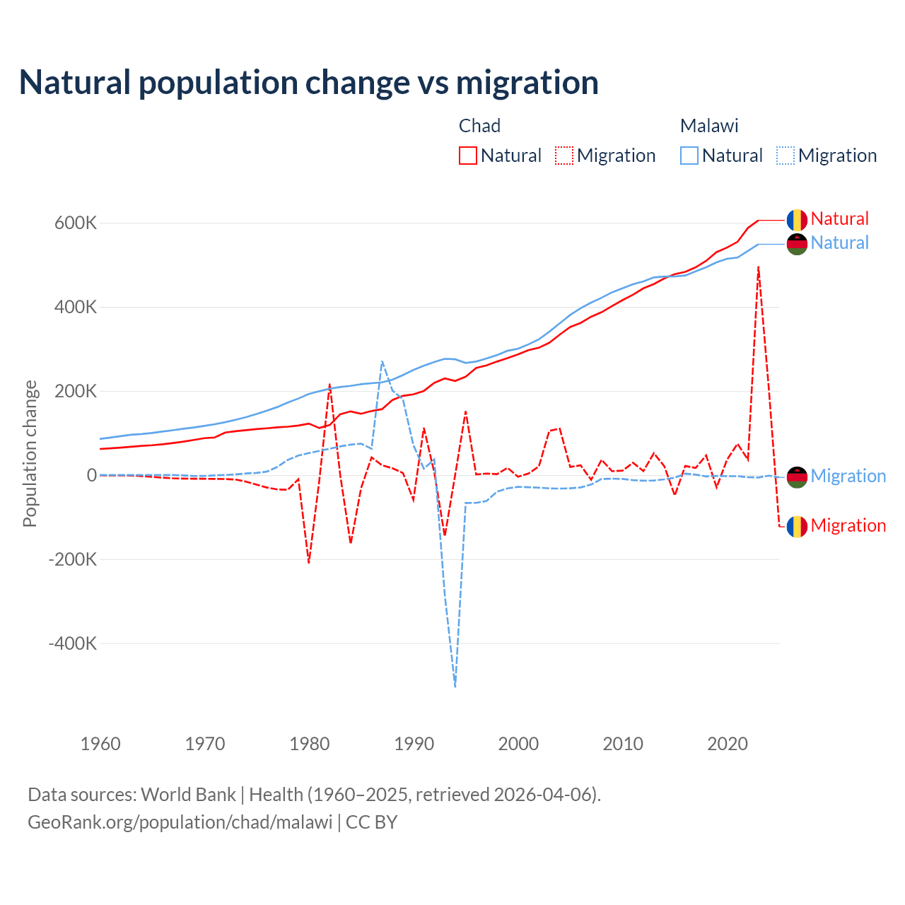 Over the last 10 years, 88.7% of the population change in Chad is from natural causes (a gain of 5,253,964 people) and 11.3% is from migration (a gain of 672,204 people). In Malawi 99.3% is from natural causes (a gain of 5,019,393 people) and 0.67% is from migration (a loss of 33,768 people).
