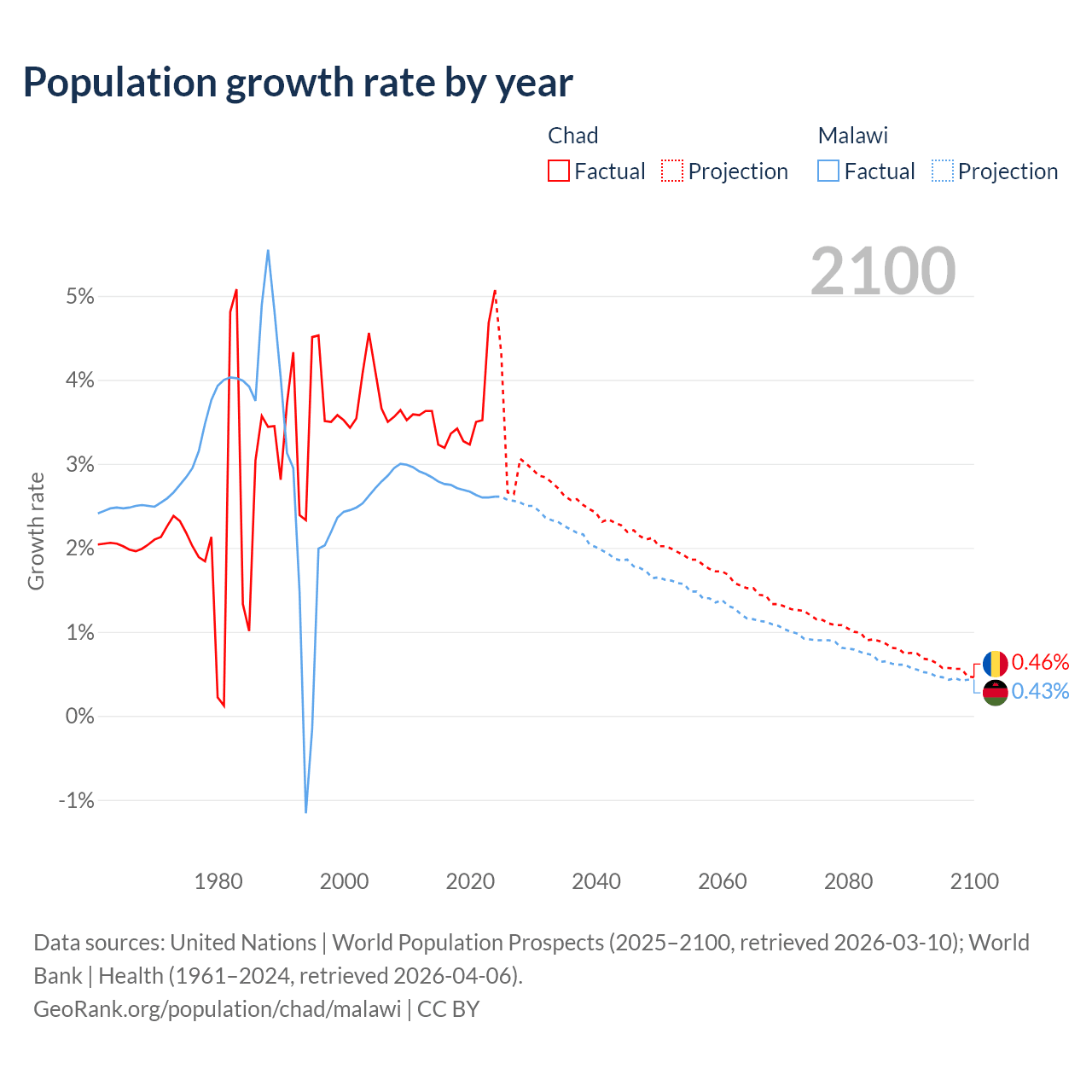- For the last 10 years, Chad has had an average growth rate of +3.65% per year vs +2.7% in Malawi.