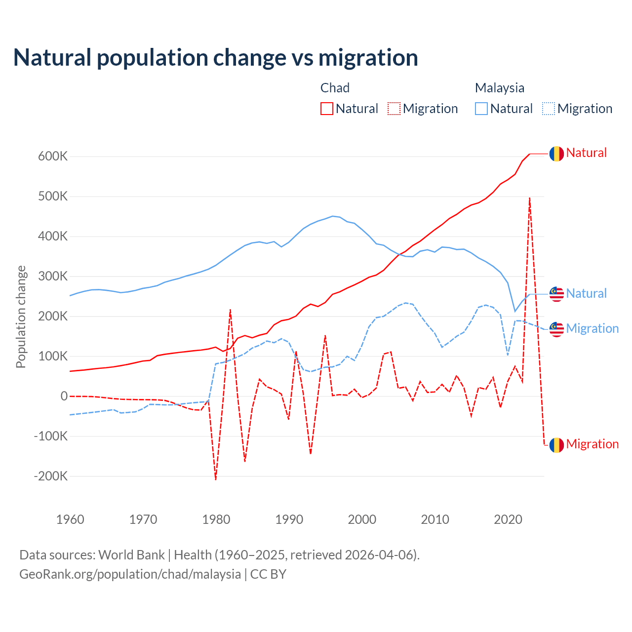 Over the last 10 years, 88.7% of the population change in Chad is from natural causes (a gain of 5,253,964 people) and 11.3% is from migration (a gain of 672,204 people). In Malaysia 61.7% is from natural causes (a gain of 3,029,648 people) and 38.3% is from migration (a gain of 1,882,159 people).
