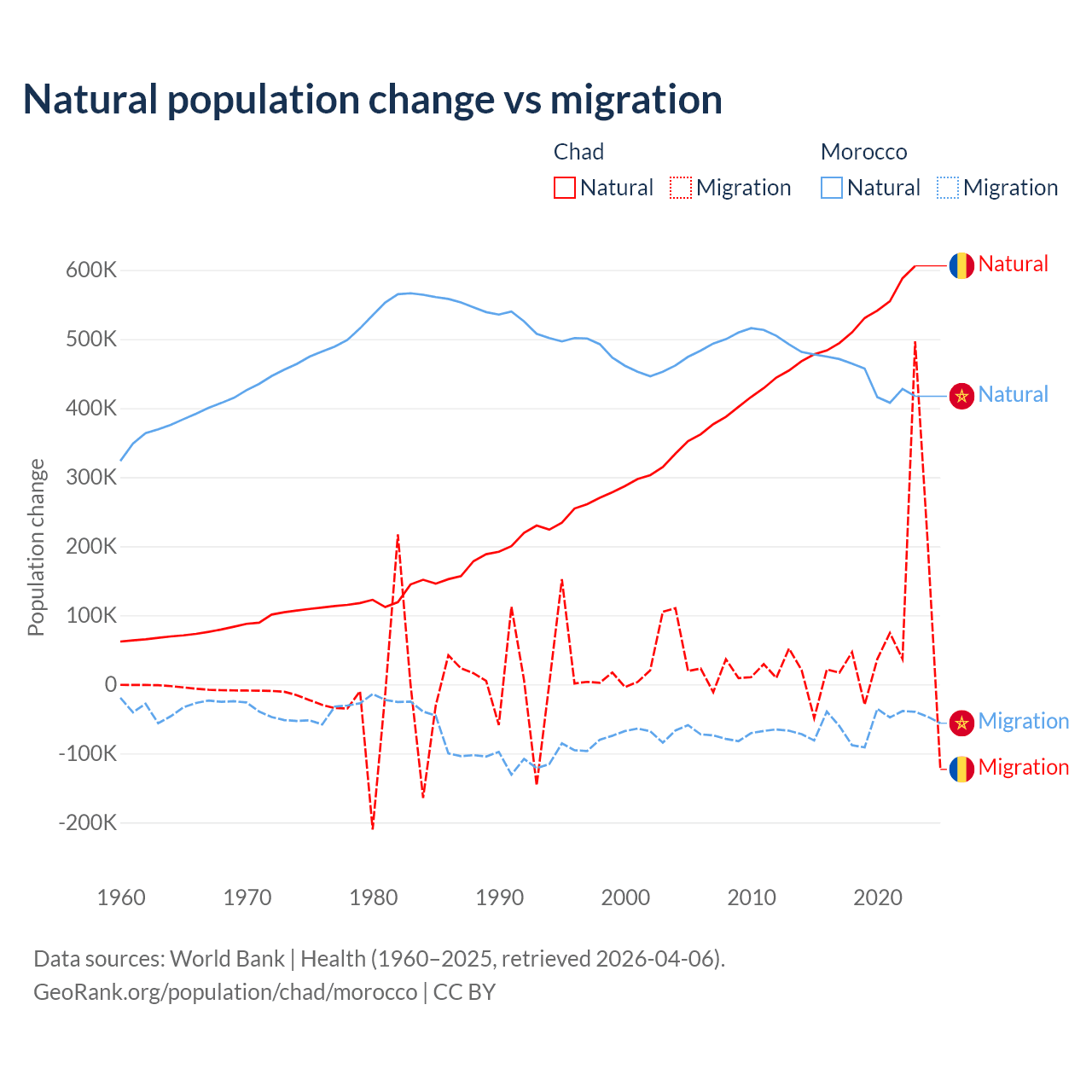 Over the last 10 years, 88.7% of the population change in Chad is from natural causes (a gain of 5,253,964 people) and 11.3% is from migration (a gain of 672,204 people). In Morocco 88.3% is from natural causes (a gain of 4,495,223 people) and 11.7% is from migration (a loss of 594,083 people).