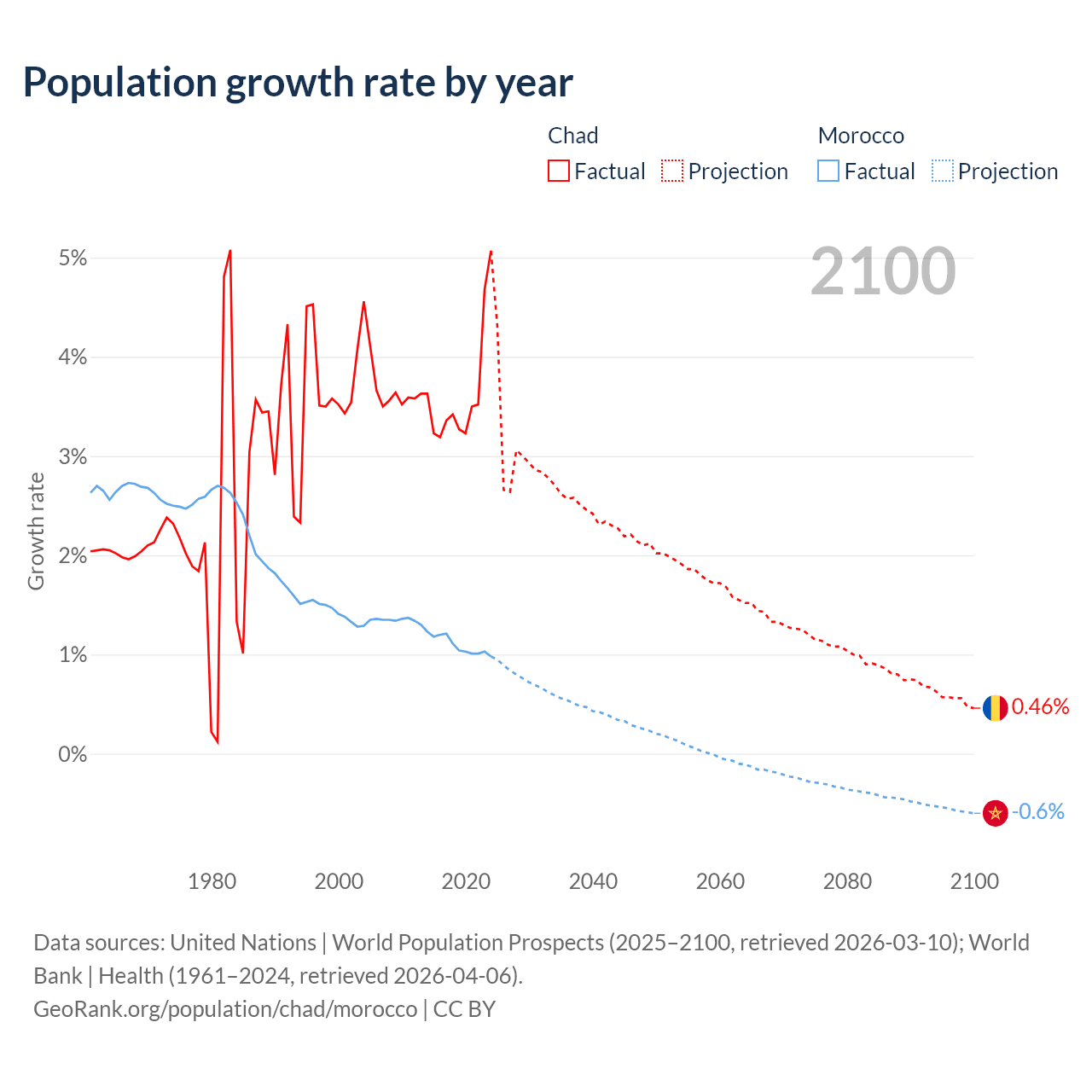 - For the last 10 years, Chad has had an average growth rate of +3.65% per year vs +1.09% in Morocco.