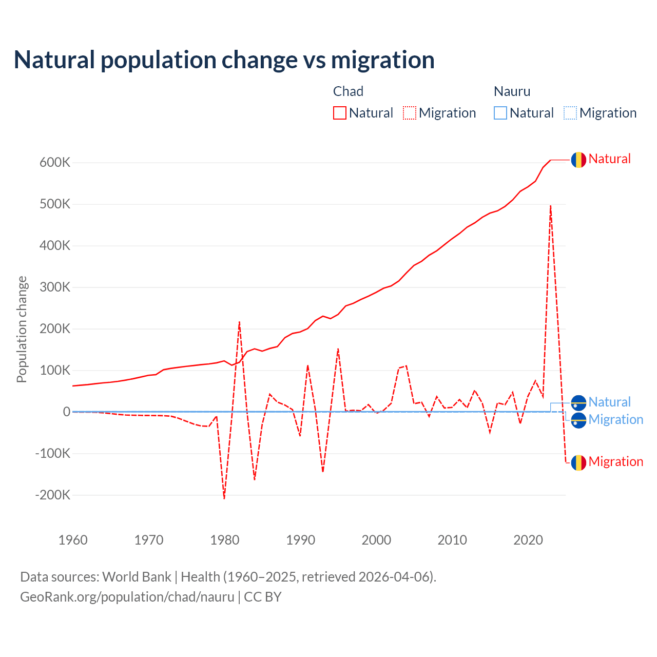 Over the last 10 years, 88.7% of the population change in Chad is from natural causes (a gain of 5,253,964 people) and 11.3% is from migration (a gain of 672,204 people). In Nauru 66.2% is from natural causes (a gain of 2,590 people) and 33.8% is from migration (a loss of 1,320 people).