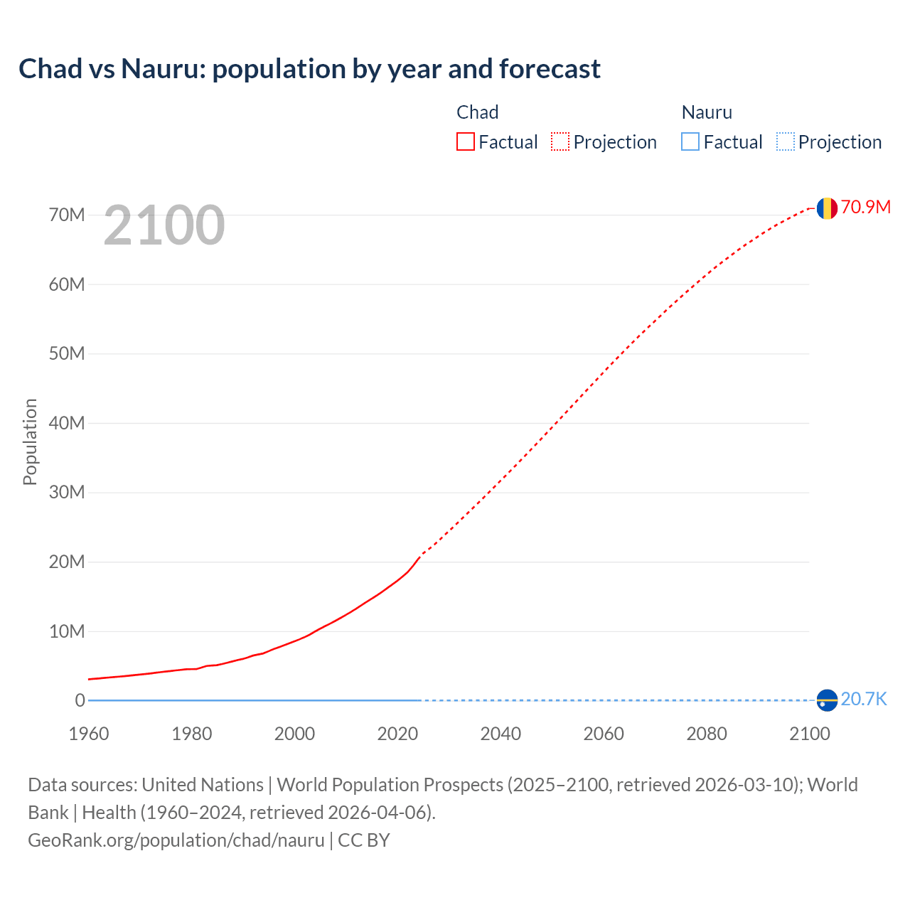 The latest officially reported population of Chad was 20,299,123 in 2024 vs 11,947 people in Nauru in 2024. In 2026, based on the adjusted UN estimation, the current Chad's population is 21,893,857 people compared to 12,125 in Nauru.