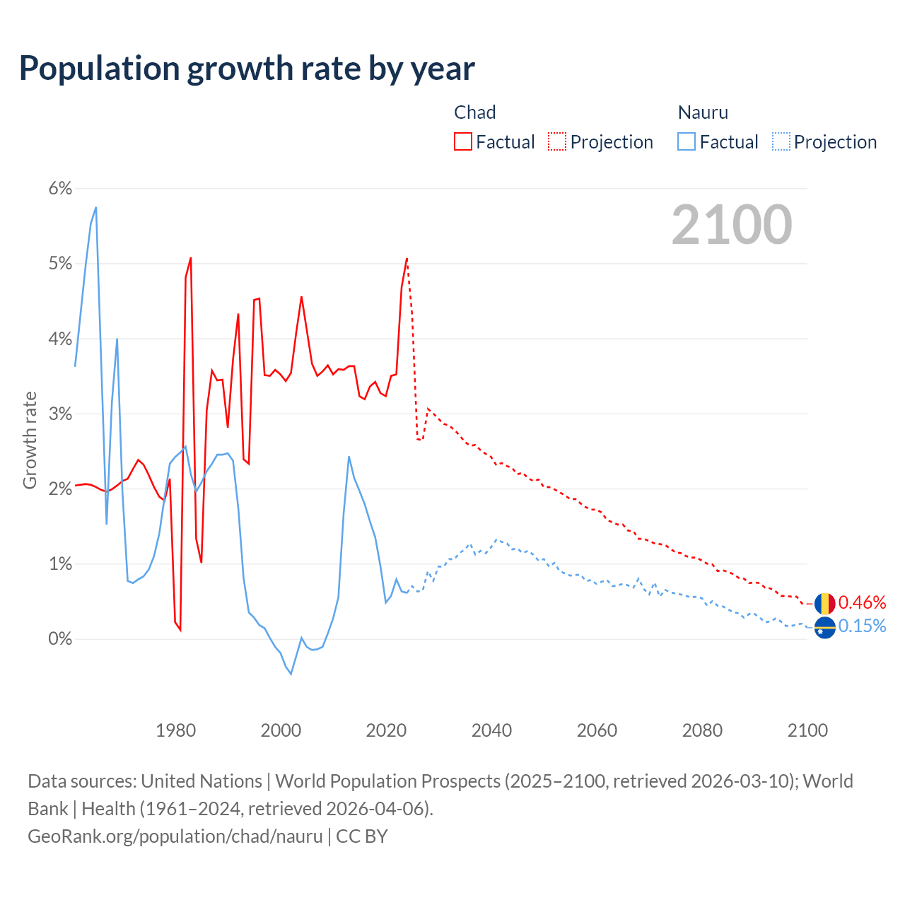 - For the last 10 years, Chad has had an average growth rate of +3.65% per year vs +1.17% in Nauru.