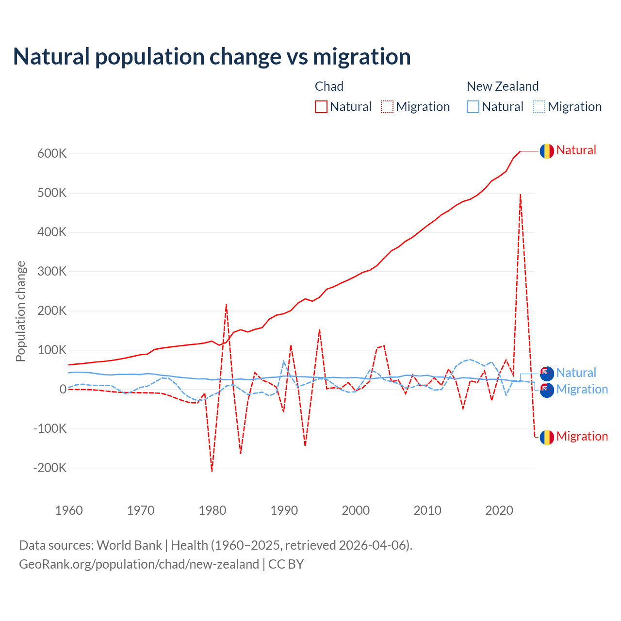 Over the last 10 years, 88.7% of the population change in Chad is from natural causes (a gain of 5,253,964 people) and 11.3% is from migration (a gain of 672,204 people). In New Zealand 34.4% is from natural causes (a gain of 247,767 people) and 65.6% is from migration (a gain of 471,602 people).