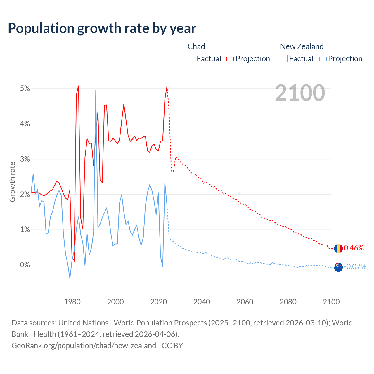 - For the last 10 years, Chad has had an average growth rate of +3.65% per year vs +1.6% in New Zealand.