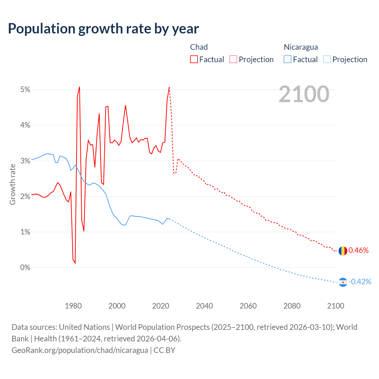 - For the last 10 years, Chad has had an average growth rate of +3.65% per year vs +1.33% in Nicaragua.