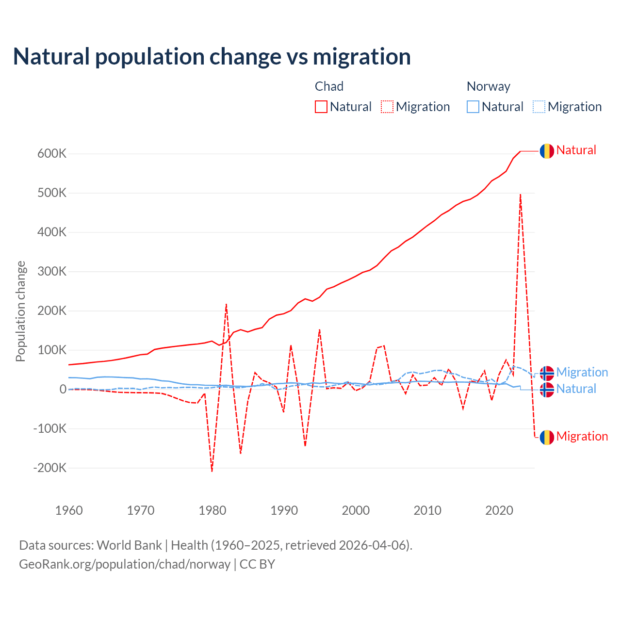 Over the last 10 years, 88.7% of the population change in Chad is from natural causes (a gain of 5,253,964 people) and 11.3% is from migration (a gain of 672,204 people). In Norway 31.3% is from natural causes (a gain of 138,699 people) and 68.7% is from migration (a gain of 303,945 people).