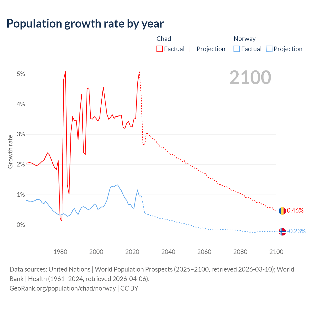 - For the last 10 years, Chad has had an average growth rate of +3.65% per year vs +0.85% in Norway.