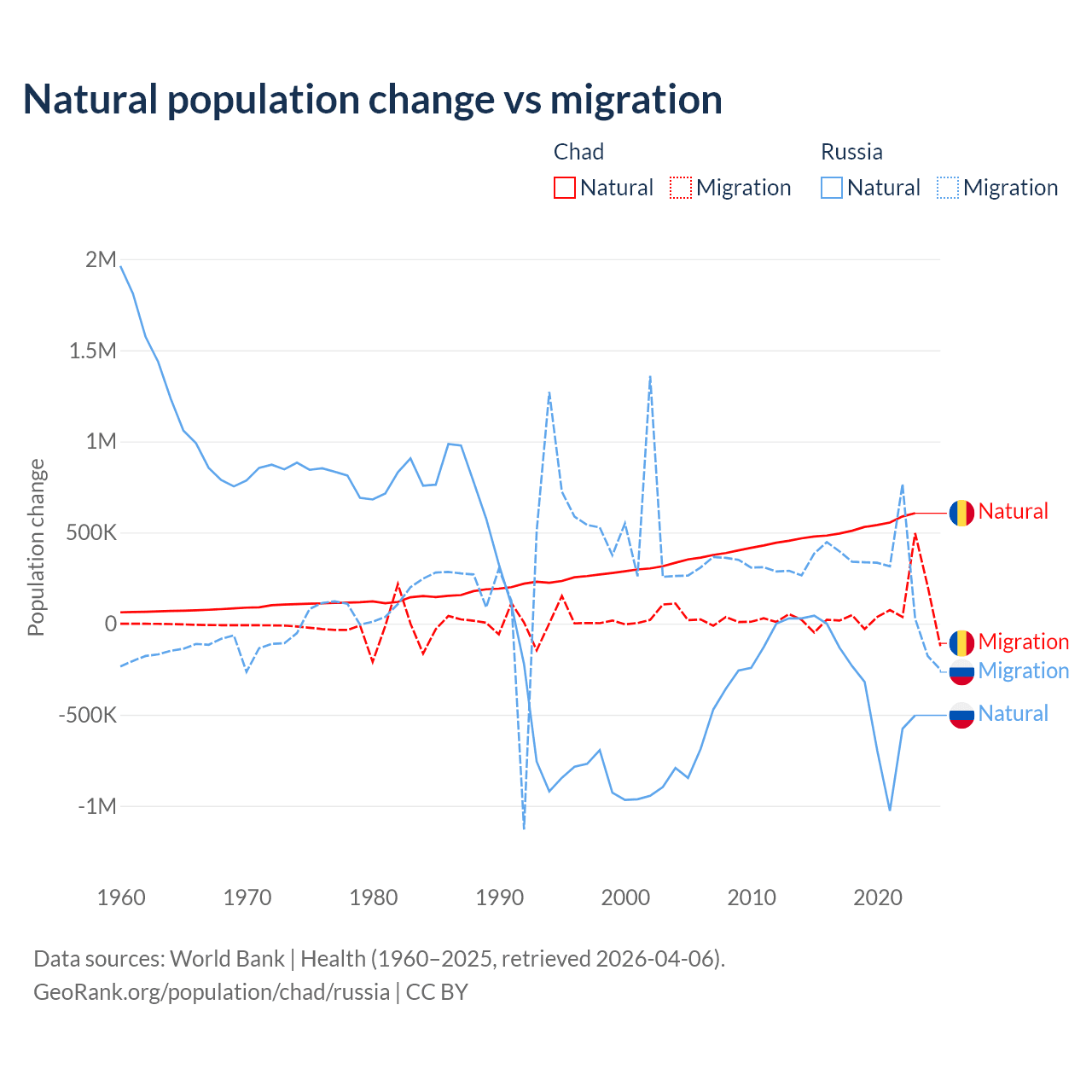 Over the last 10 years, 88.7% of the population change in Chad is from natural causes (a gain of 5,253,964 people) and 11.3% is from migration (a gain of 672,204 people). In Russia 48.6% is from natural causes (a loss of 3,416,377 people) and 51.4% is from migration (a gain of 3,611,826 people).