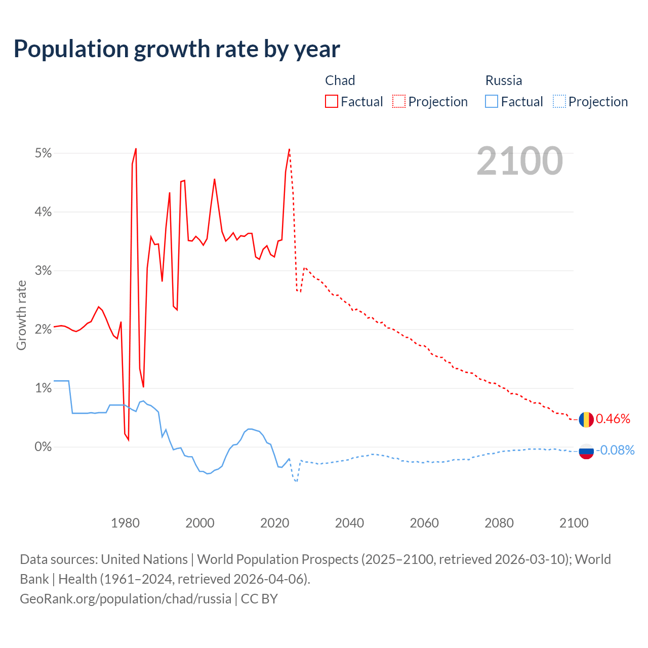 - For the last 10 years, Chad has had an average growth rate of +3.65% per year vs -0.02% in Russia.