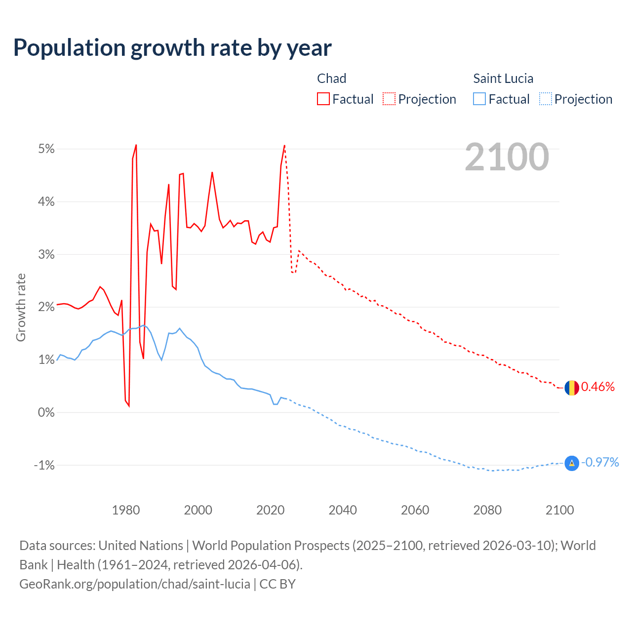 - For the last 10 years, Chad has had an average growth rate of +3.65% per year vs +0.33% in Saint Lucia.