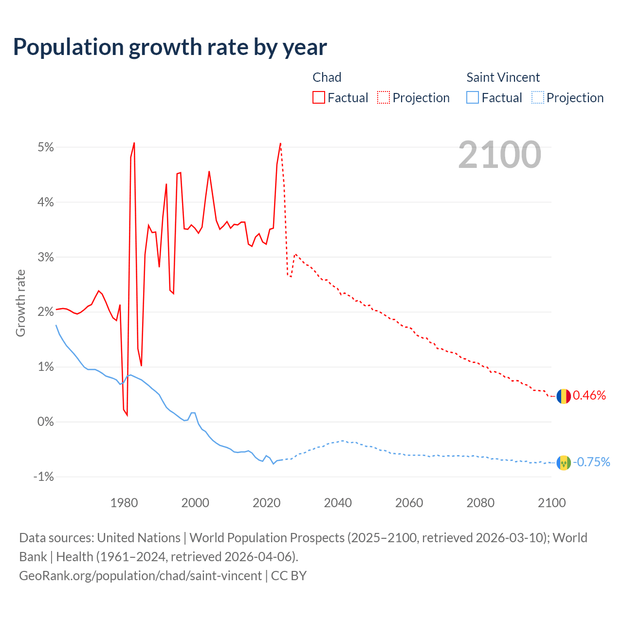 - For the last 10 years, Chad has had an average growth rate of +3.65% per year vs -0.65% in Saint Vincent.