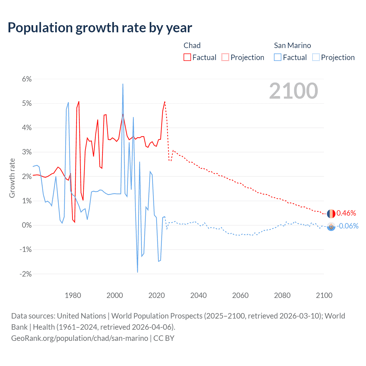 - For the last 10 years, Chad has had an average growth rate of +3.65% per year vs +0.26% in San Marino.