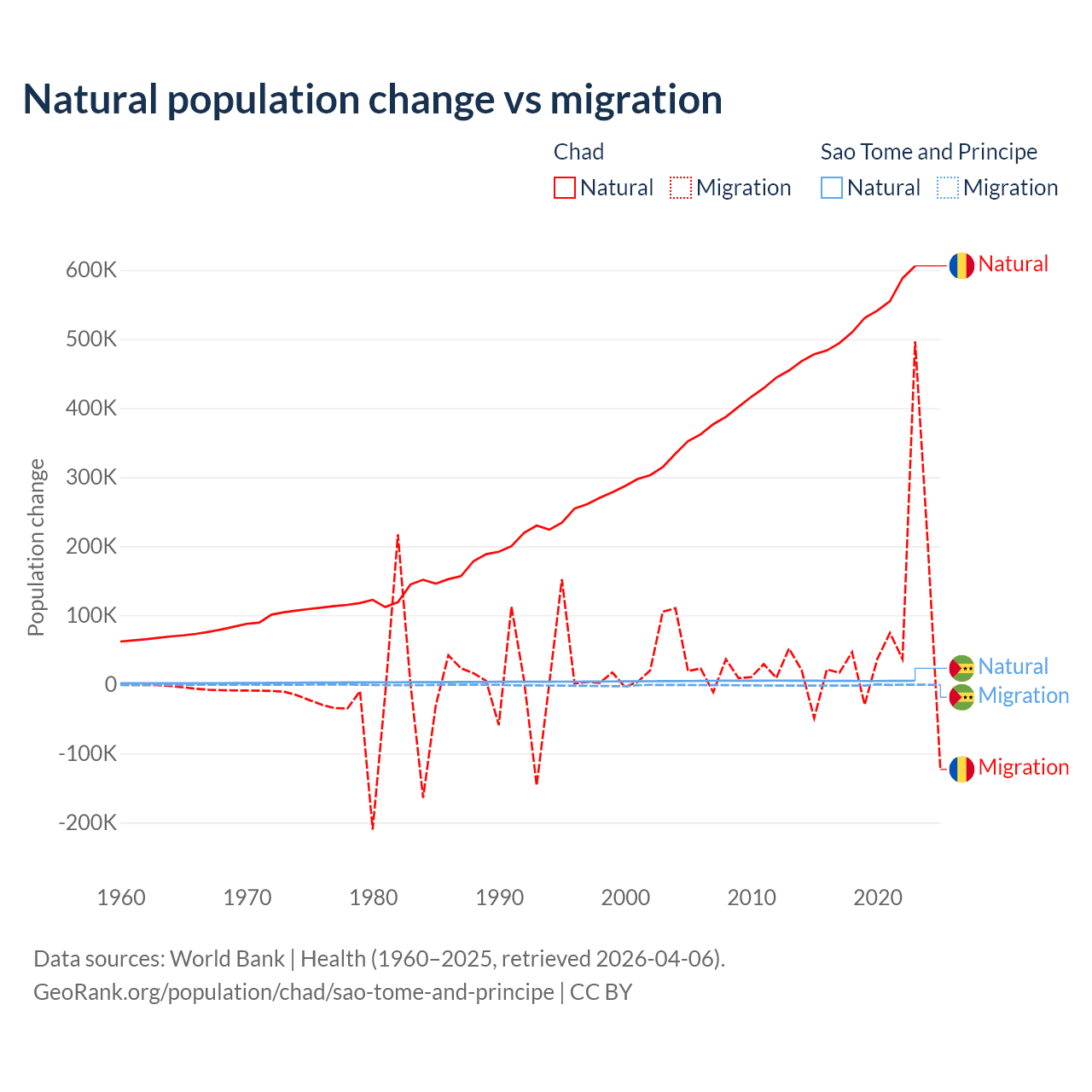 Over the last 10 years, 88.7% of the population change in Chad is from natural causes (a gain of 5,253,964 people) and 11.3% is from migration (a gain of 672,204 people). In Sao Tome and Principe 80.1% is from natural causes (a gain of 50,822 people) and 19.9% is from migration (a loss of 12,621 people).
