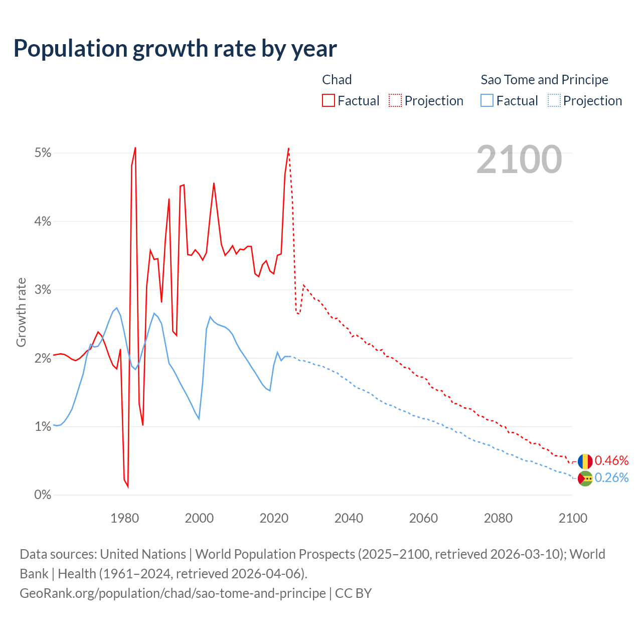 - For the last 10 years, Chad has had an average growth rate of +3.65% per year vs +1.82% in Sao Tome and Principe.