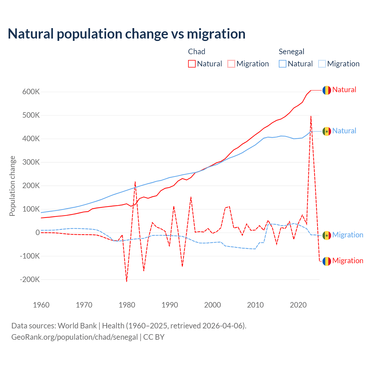 Over the last 10 years, 88.7% of the population change in Chad is from natural causes (a gain of 5,253,964 people) and 11.3% is from migration (a gain of 672,204 people). In Senegal 93.9% is from natural causes (a gain of 4,089,205 people) and 6.13% is from migration (a gain of 267,266 people).