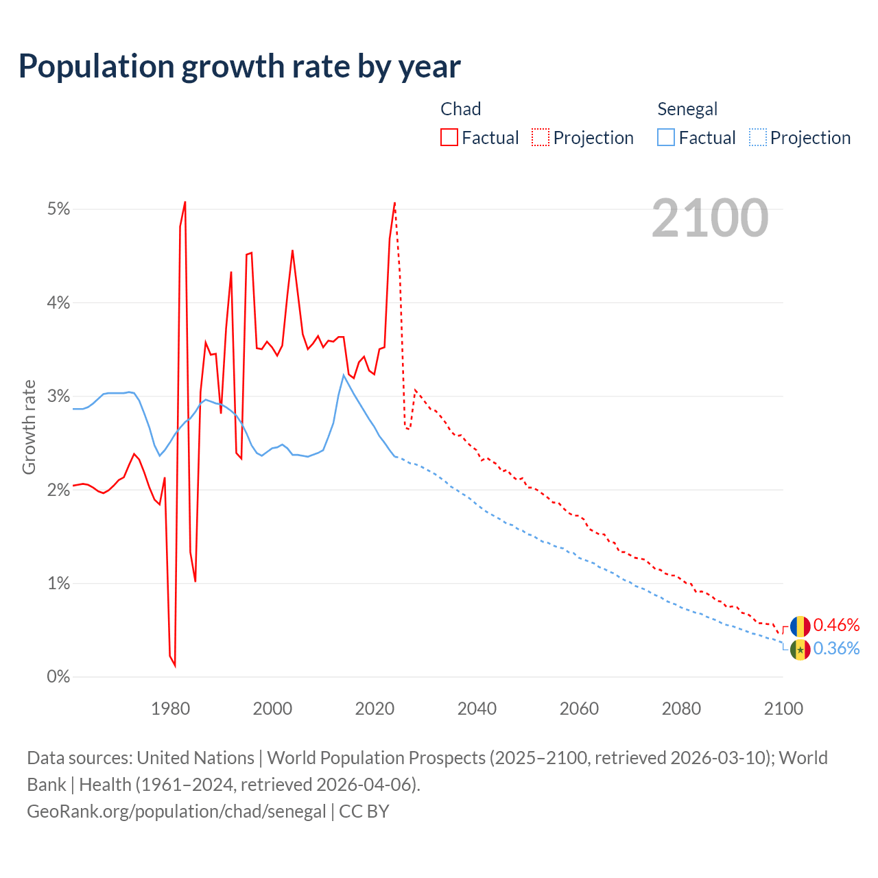 - For the last 10 years, Chad has had an average growth rate of +3.65% per year vs +2.76% in Senegal.