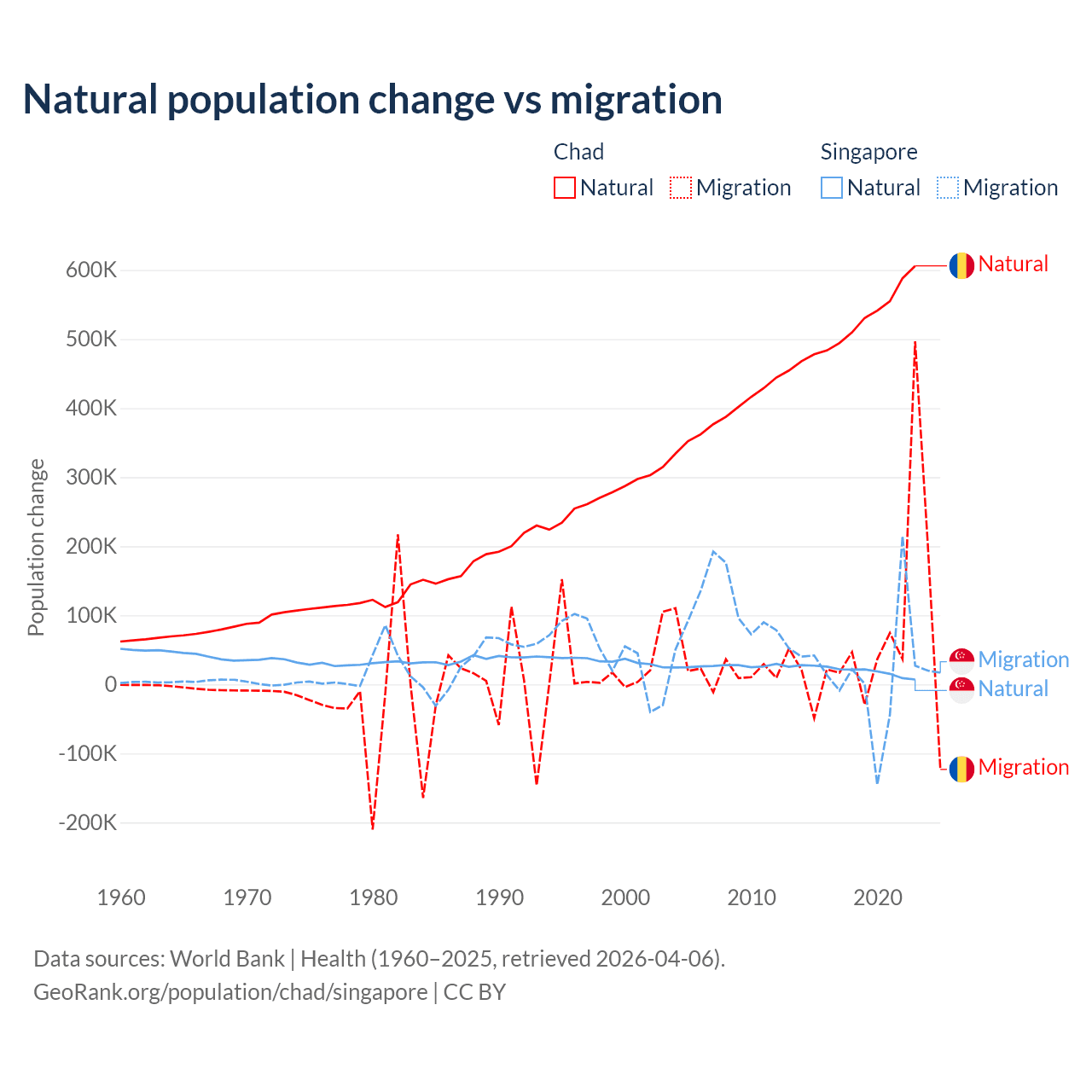 Over the last 10 years, 88.7% of the population change in Chad is from natural causes (a gain of 5,253,964 people) and 11.3% is from migration (a gain of 672,204 people). In Singapore 54.8% is from natural causes (a gain of 195,953 people) and 45.2% is from migration (a gain of 161,805 people).