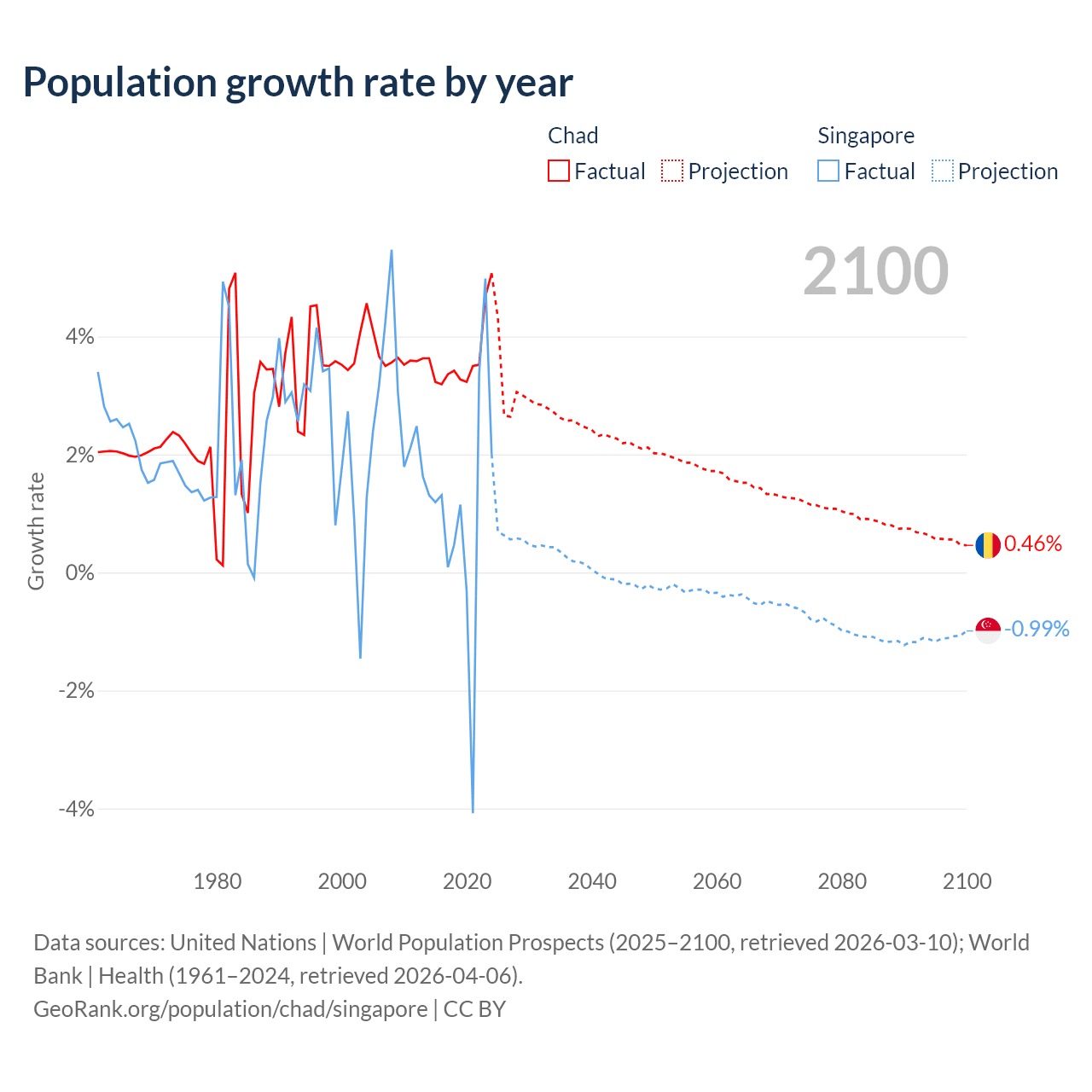 - For the last 10 years, Chad has had an average growth rate of +3.65% per year vs +1.04% in Singapore.