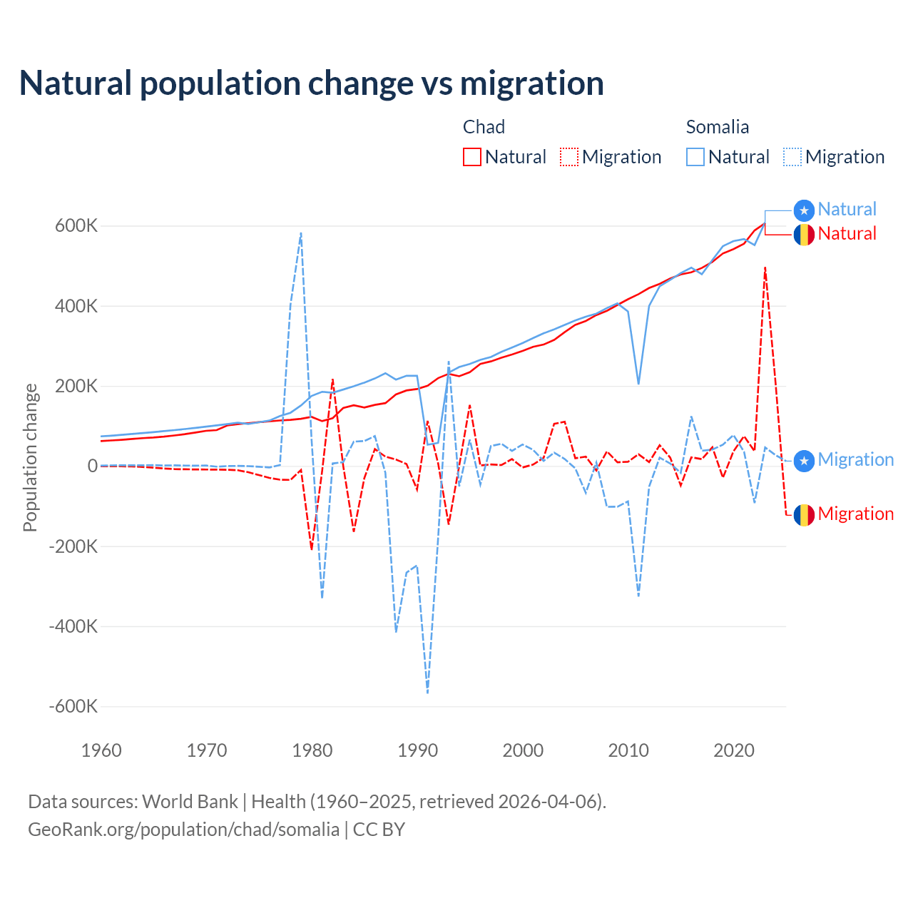 Over the last 10 years, 88.7% of the population change in Chad is from natural causes (a gain of 5,253,964 people) and 11.3% is from migration (a gain of 672,204 people). In Somalia 94.4% is from natural causes (a gain of 5,270,105 people) and 5.58% is from migration (a gain of 311,487 people).