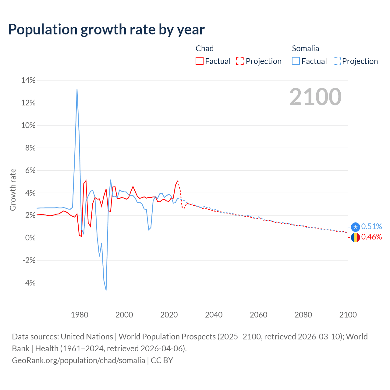 - For the last 10 years, Chad has had an average growth rate of +3.65% per year vs +3.61% in Somalia.