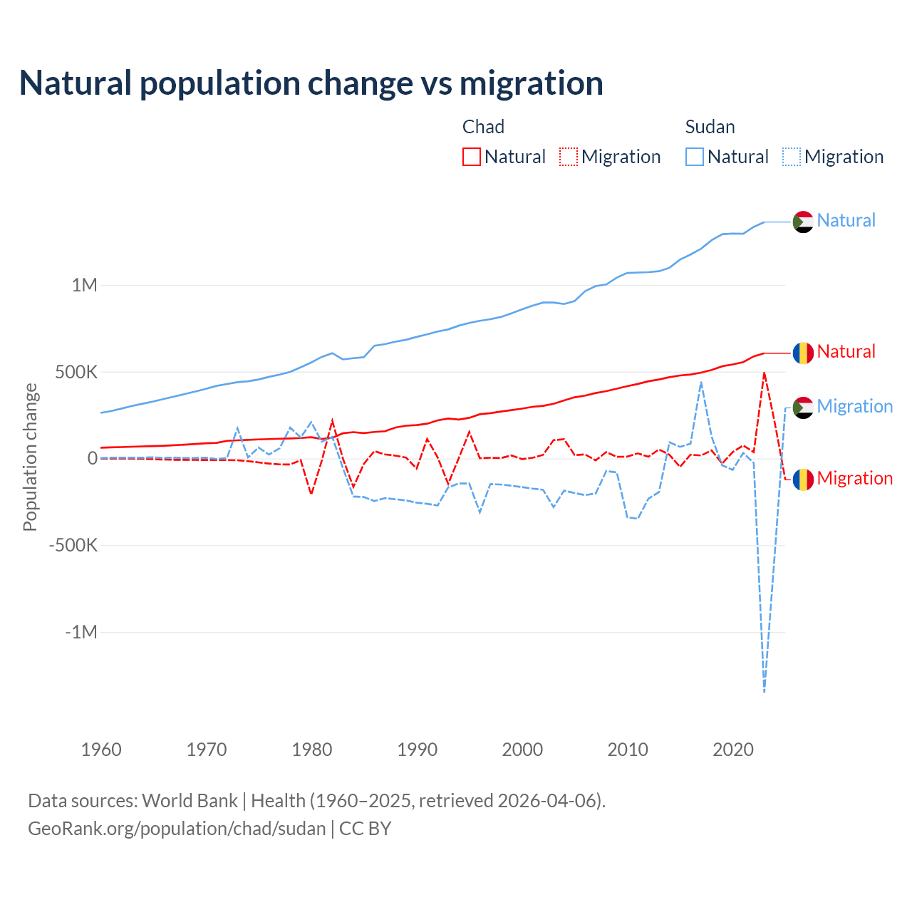 Over the last 10 years, 88.7% of the population change in Chad is from natural causes (a gain of 5,253,964 people) and 11.3% is from migration (a gain of 672,204 people). In Sudan 95.1% is from natural causes (a gain of 12,459,977 people) and 4.88% is from migration (a loss of 639,596 people).