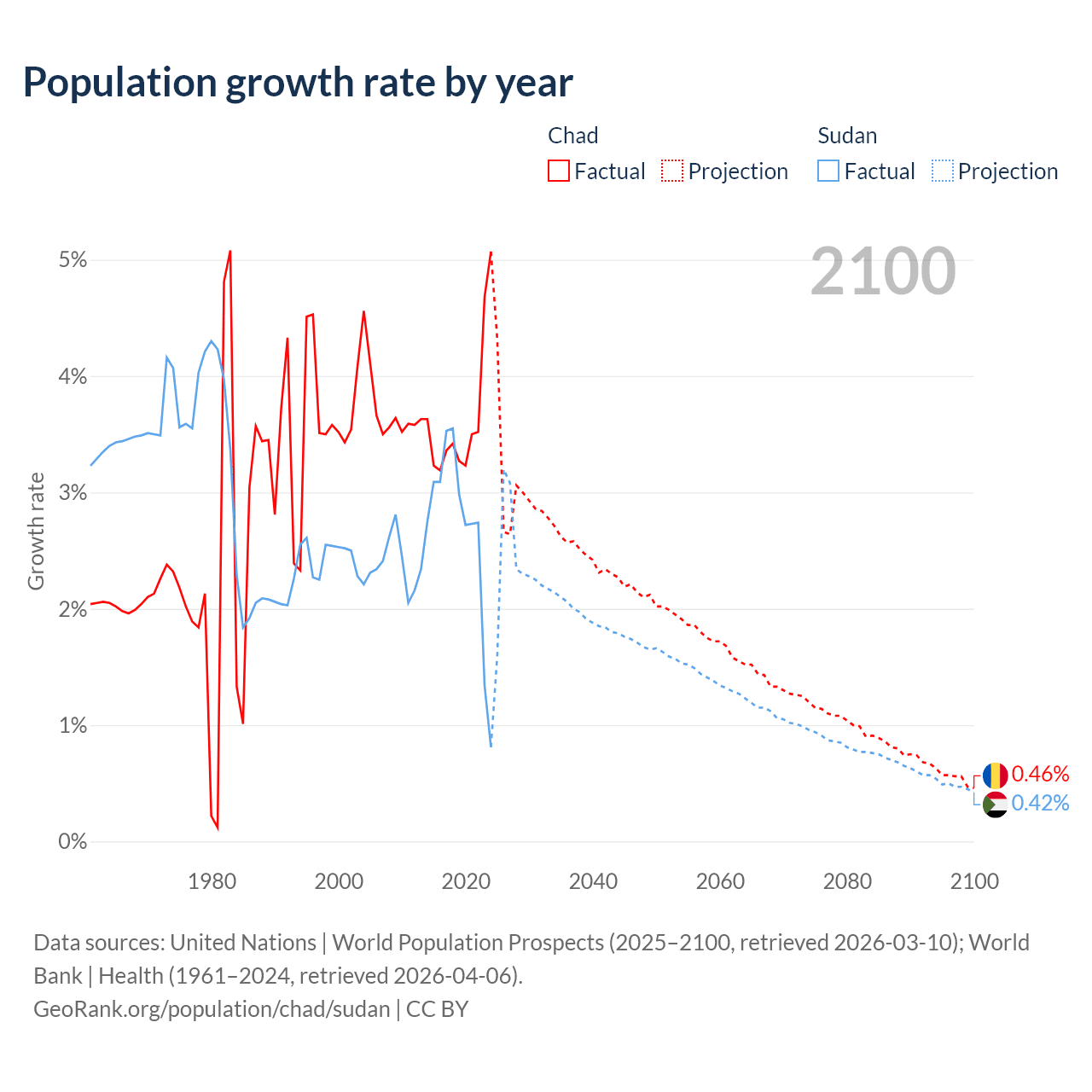 - For the last 10 years, Chad has had an average growth rate of +3.65% per year vs +2.67% in Sudan.