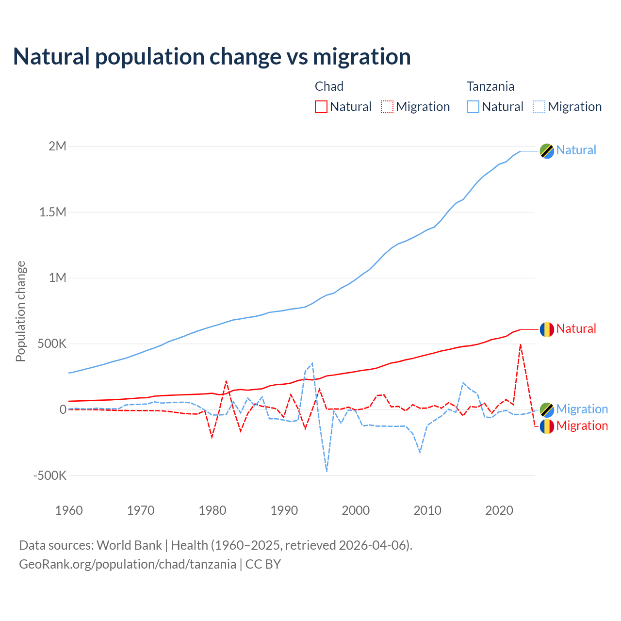 Over the last 10 years, 88.7% of the population change in Chad is from natural causes (a gain of 5,253,964 people) and 11.3% is from migration (a gain of 672,204 people). In Tanzania 98.7% is from natural causes (a gain of 17,769,541 people) and 1.27% is from migration (a gain of 229,466 people).