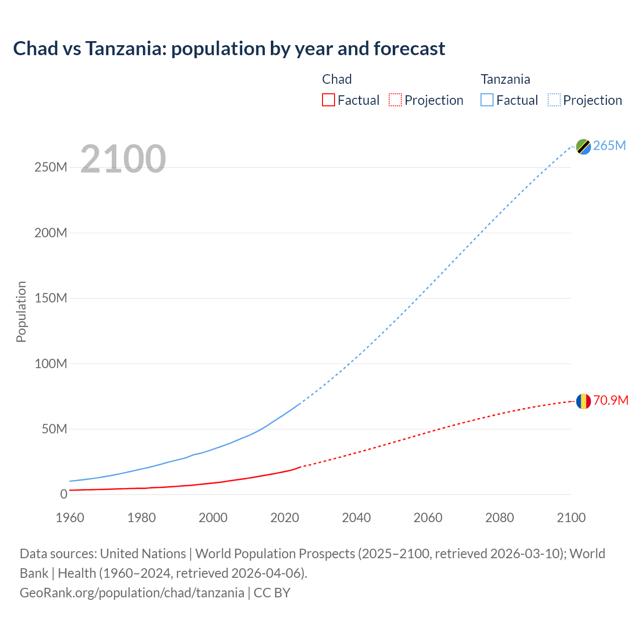- The countries together account for 1.15% of the world: 0.26% for Chad vs 0.88% for Tanzania.