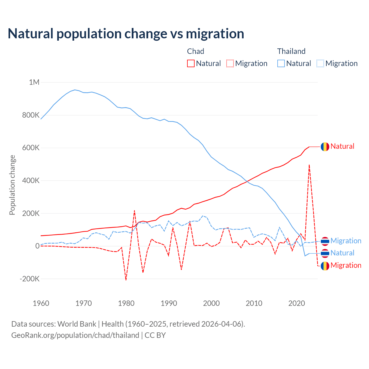 Over the last 10 years, 88.7% of the population change in Chad is from natural causes (a gain of 5,253,964 people) and 11.3% is from migration (a gain of 672,204 people). In Thailand 78.4% is from natural causes (a gain of 1,292,528 people) and 21.6% is from migration (a gain of 355,361 people).
