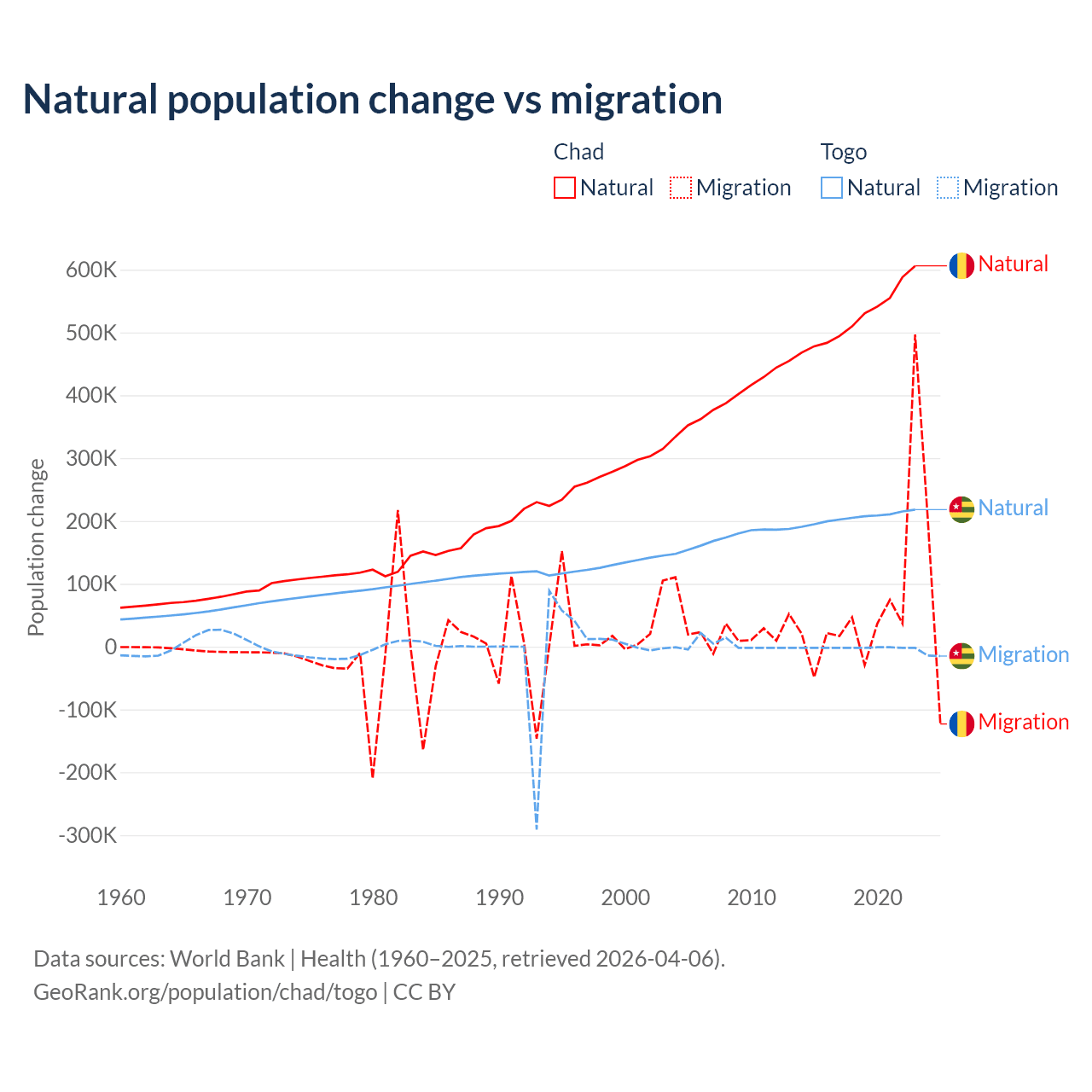 Over the last 10 years, 88.7% of the population change in Chad is from natural causes (a gain of 5,253,964 people) and 11.3% is from migration (a gain of 672,204 people). In Togo 99.1% is from natural causes (a gain of 2,052,115 people) and 0.86% is from migration (a loss of 17,852 people).