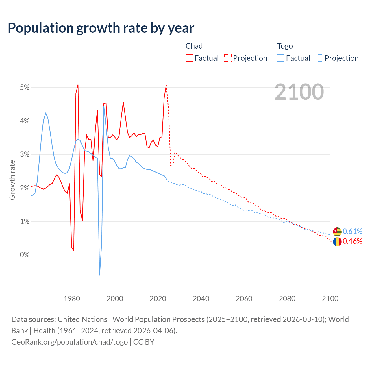 - For the last 10 years, Chad has had an average growth rate of +3.65% per year vs +2.46% in Togo.